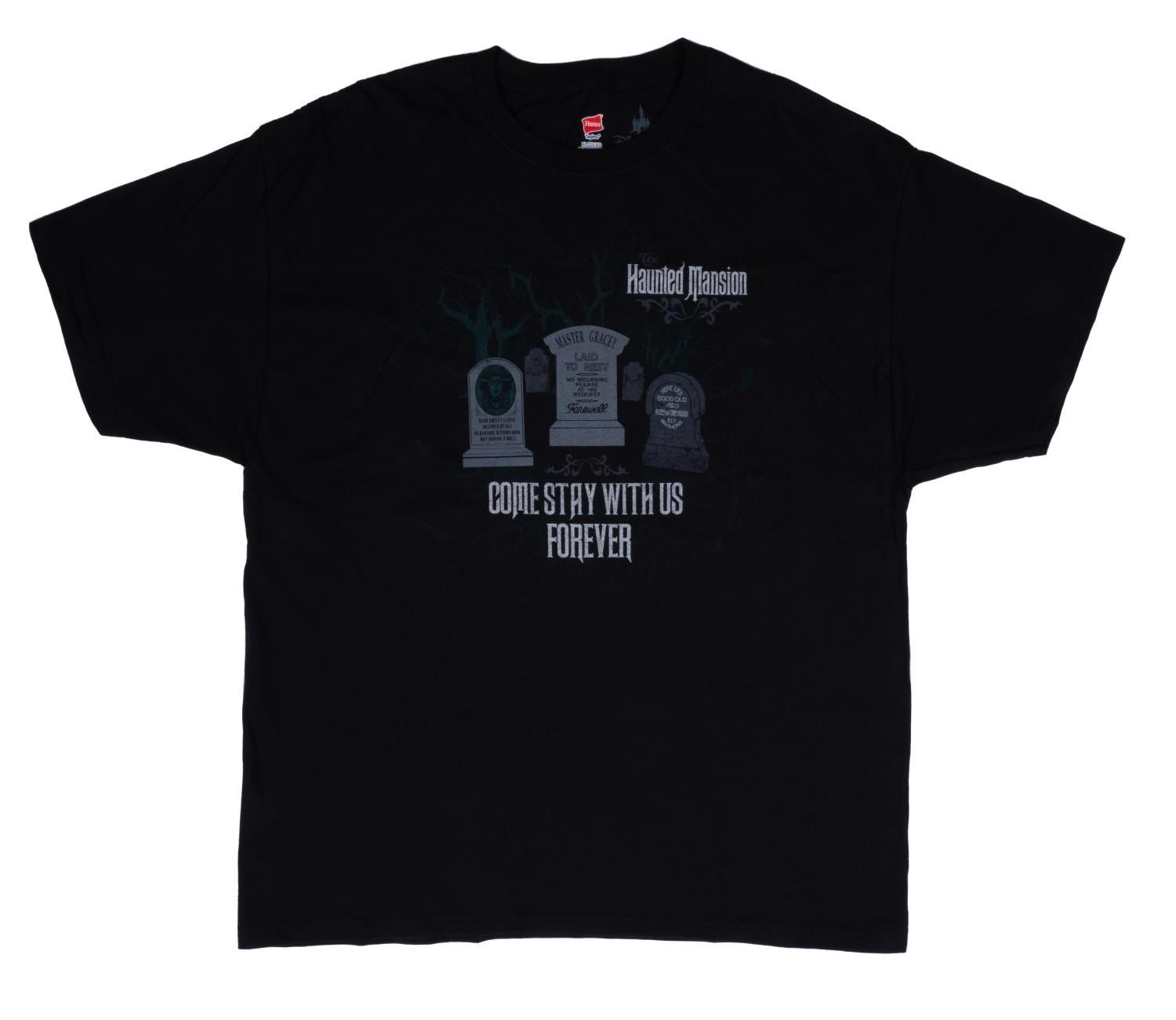 (Disney Parks) A Haunted Mansion t-shirt depicting tombstones and epitaphs of Good Old Fred, Madame Leota, and Master Gracey. Measuring a size XL, the shirt is in fine condition.