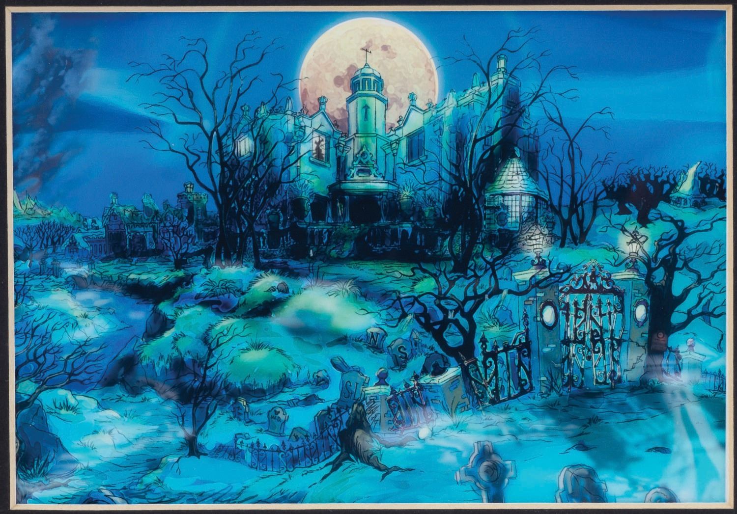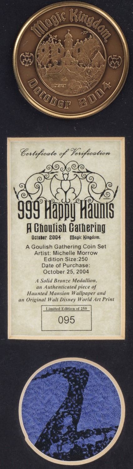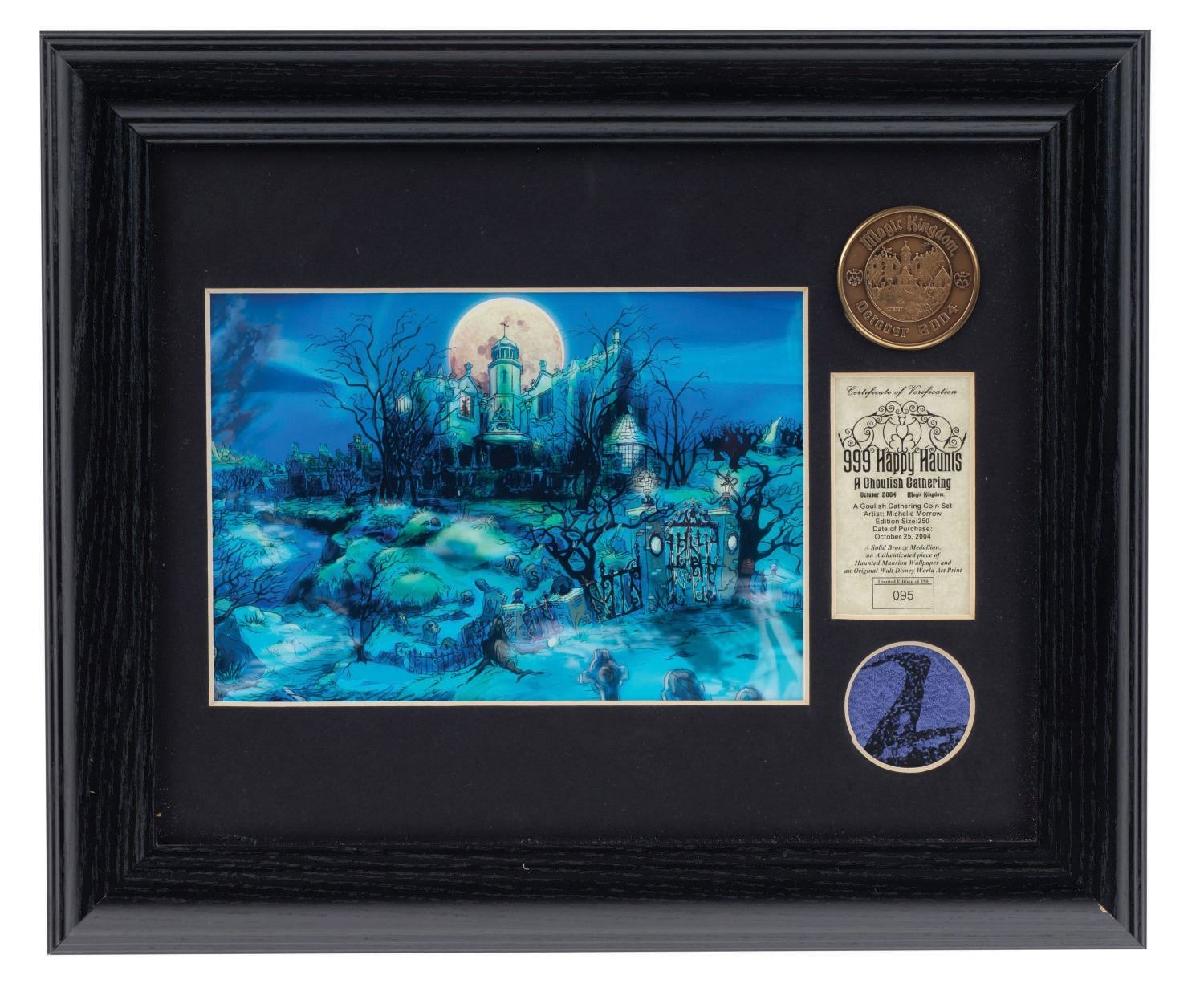 (Walt Disney World, 2004) A Ghoulish Gathering Coin Set released for the "999 Happy Haunts - A Ghoulish Gathering" at The Magic Kingdom. The framed piece is numbered "095" out of an edition of 250, and contains a commemorative coin, original Walt Disney World art print by Michelle Morrow, and an authenticated piece of Haunted Mansion wallpaper. Measuring approximately 10.25"x12", the entire piece displays in fine as-new condition, retaining a COA on reverse.