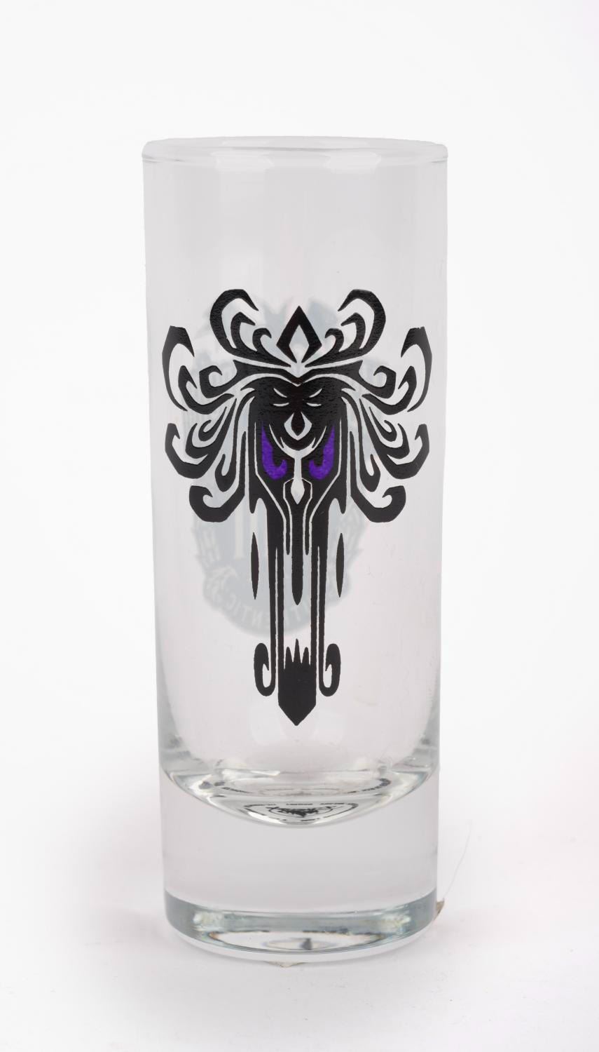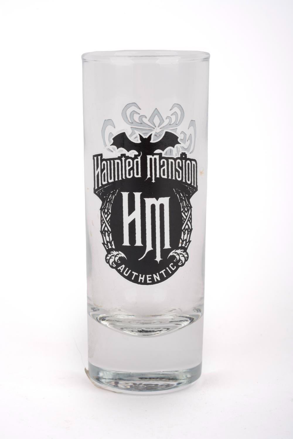 (Disney Parks) A Haunted Mansion Wallpaper pattern shot glass. The 4" glass is in fine unused condition.