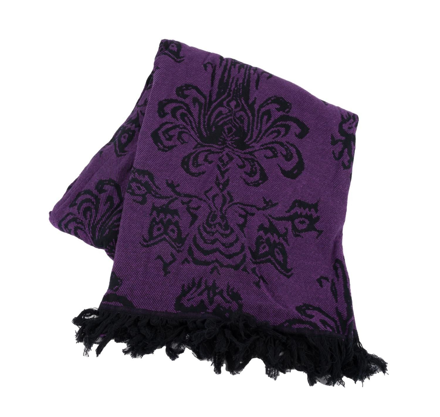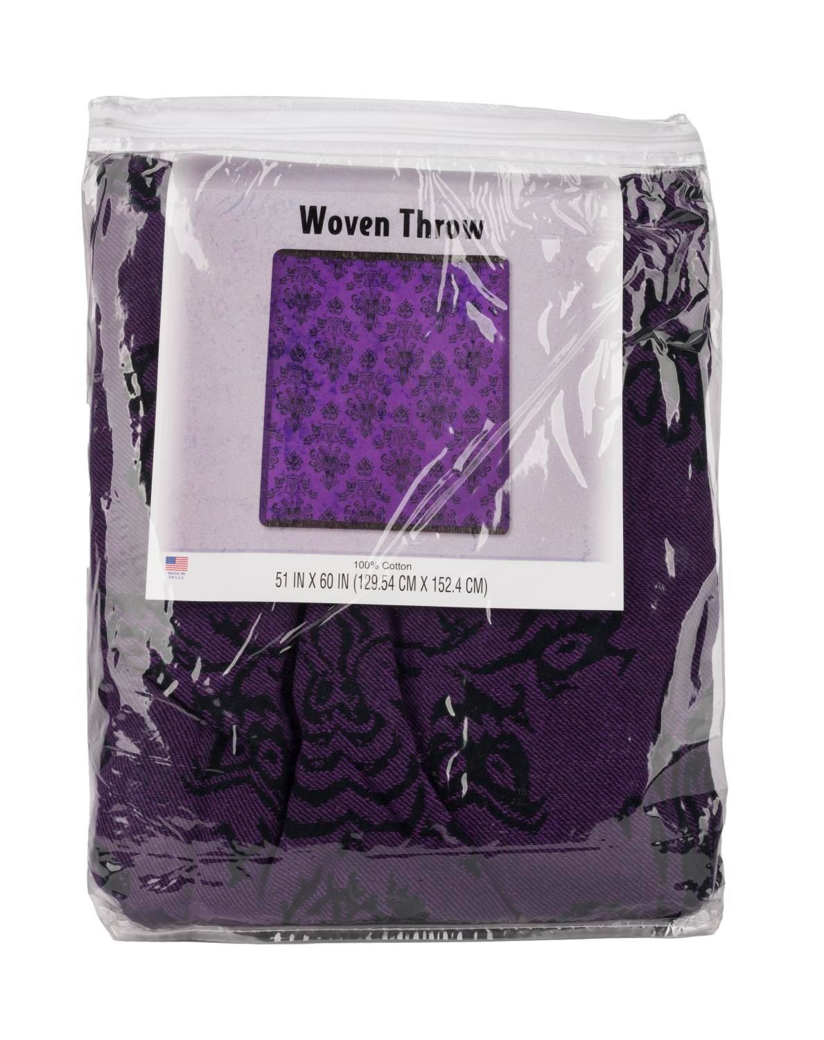 (Disney Parks, 2000s) A Haunted Mansion woven throw blanket patterned with the Mansion's purple wallpaper. Measuring 51" x 60" this luxurious 100% cotton throw is ideal as a coverlet, lap blanket, or wall hanging, and is in fine condition in original packaging.