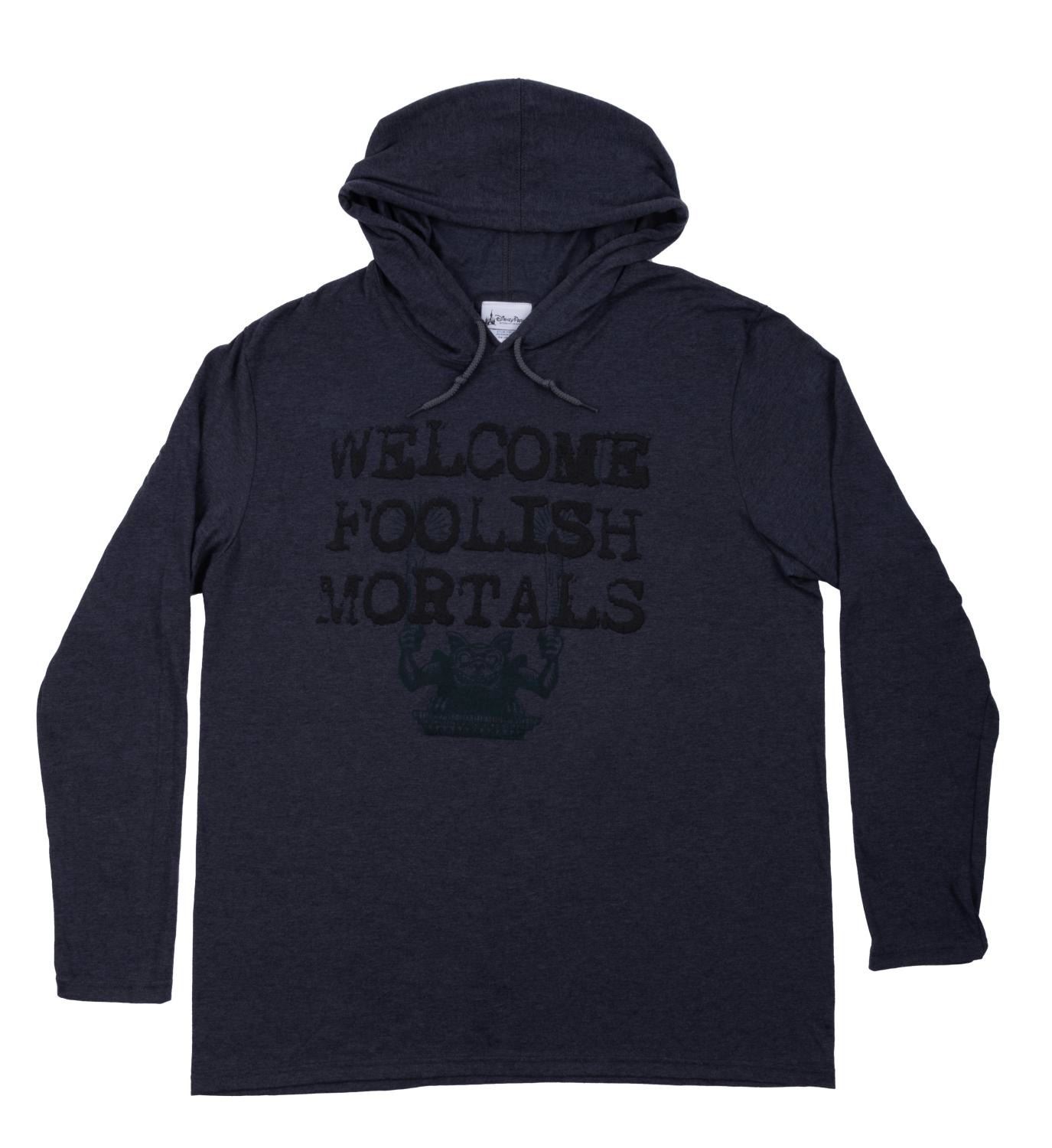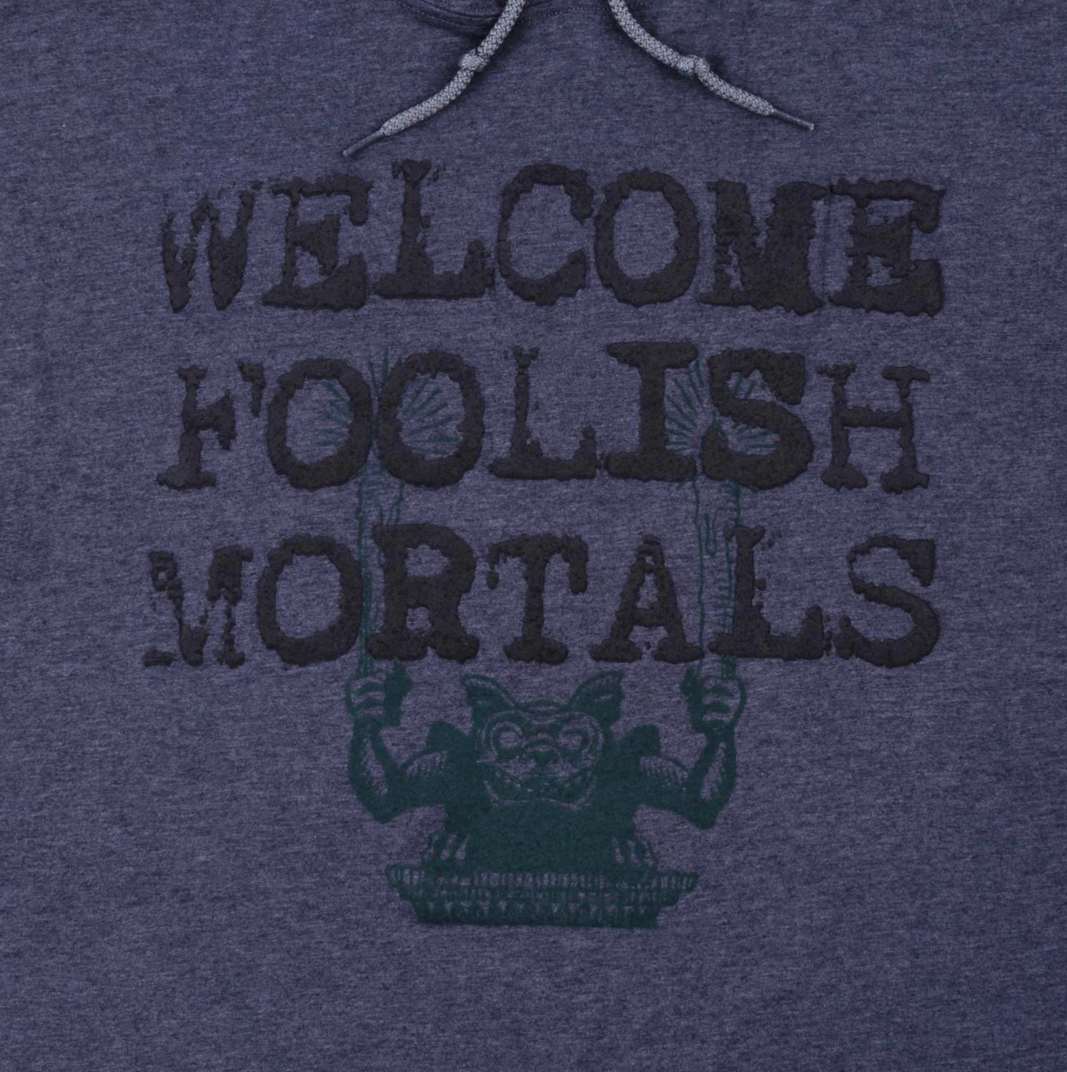 (Disney Parks) A "Welcome Foolish Mortals" hoodie featuring a Haunted Mansion gargoyle and the popular expression in a raised font. Measuring a size XL, the shirt is in fine condition.