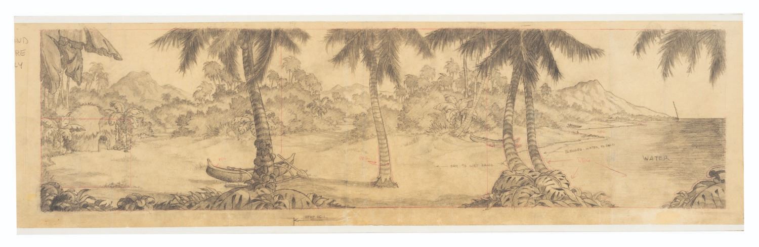 (Disney, 1937) An original pan background layout drawing from the Mickey Mouse short "Hawaiian Holiday.” The drawing has an image size of 8.25” x 30” on 9” x 32” animation paper, and is adhered to 9.75” x 32” artist board. The graphite and color pencil drawing is in good condition with discoloration from age, signs of repair, and wear from production use including light stains, pinholes, creases, tape on the reverse, and a fold to the right edge.