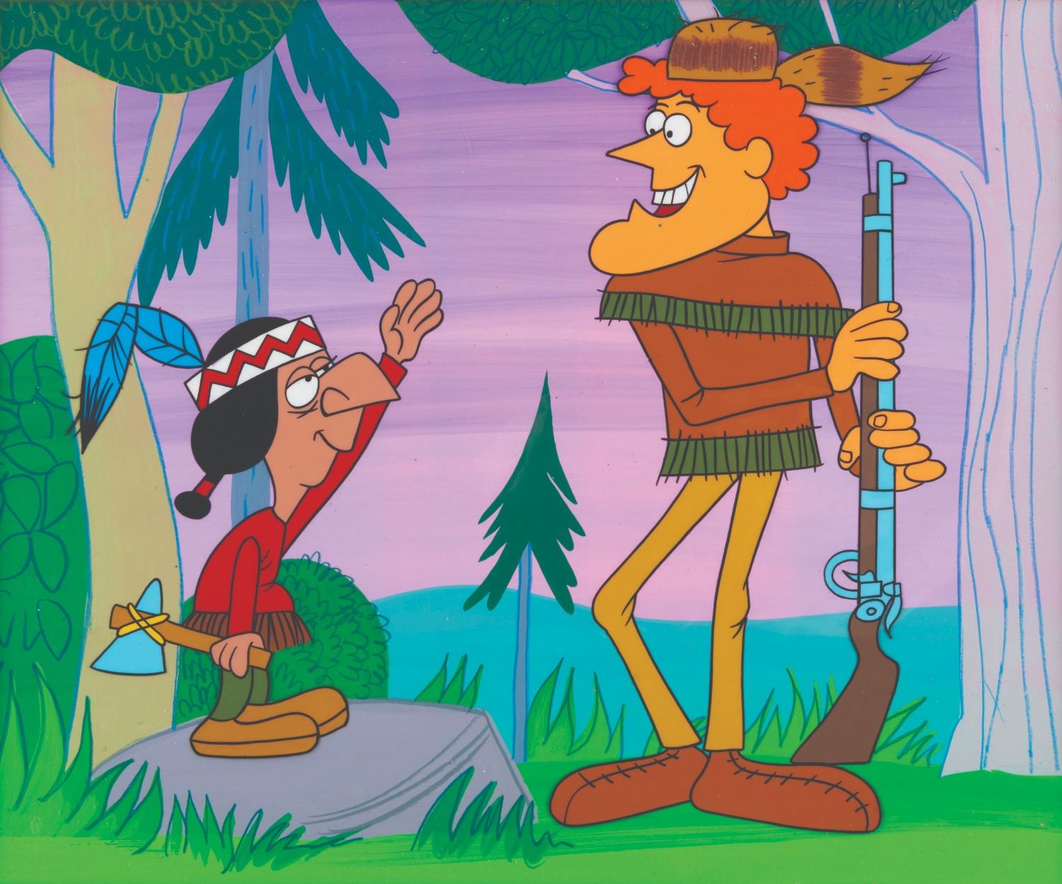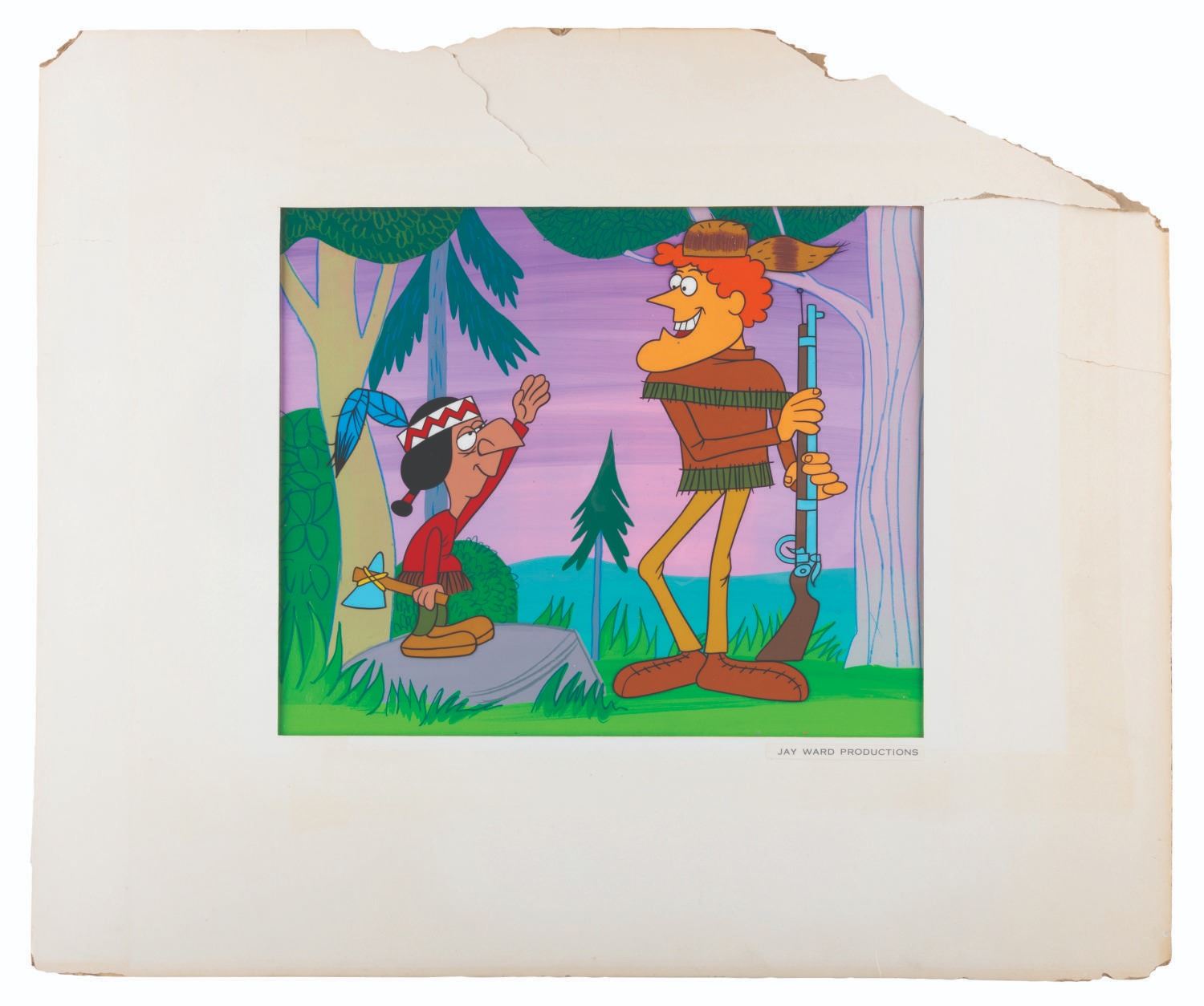 (Ward, 1969) A hand-painted publicity cel and background for “Hawkear and Pierced Arrow” by Lew Keller. The Jay Ward Productions pilot, which was not picked up, was based on the novel “The Last of the Mohicans” and influenced by the TV show “Hawkeye and the Last of the Mohicans.” With a visible size of 9.25” x 11.25” and a character image of 8.5” x 9.25”, the cel and background are in fine condition. The Jay Ward Productions presentation matte measures 16.75” x 20” and is in poor condition with heavy edge wear, discoloration from age, tears along the edges measuring between 3” and 4”, and an 8” of the upper right corner has been torn off.