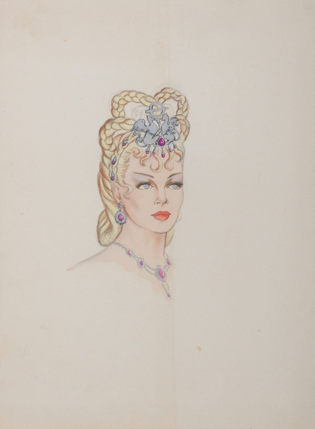 (1950s-1960s) A concept art study of a costume including an ornate griffin headdress and necklace. Accomplished in gouache and pencil on artist board measuring 11"x15", the art is in very good condition, with light wear from production use and age.