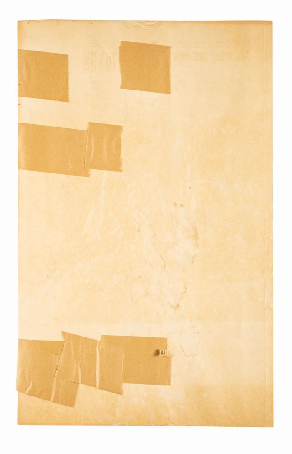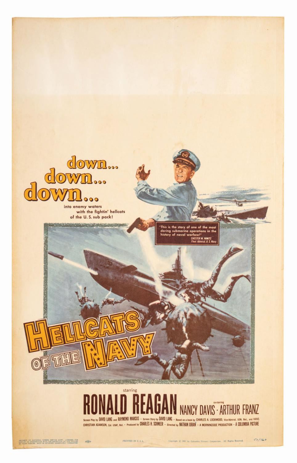 (Columbia, 1957) A window card for the World War II film "Hellcats of the Navy," starring future U.S. President Ronald Reagan. Measuring 14" x 22", the window card is in good condition with creases, edge wear, discoloration from age, and the reverse exhibits tape and water damage.