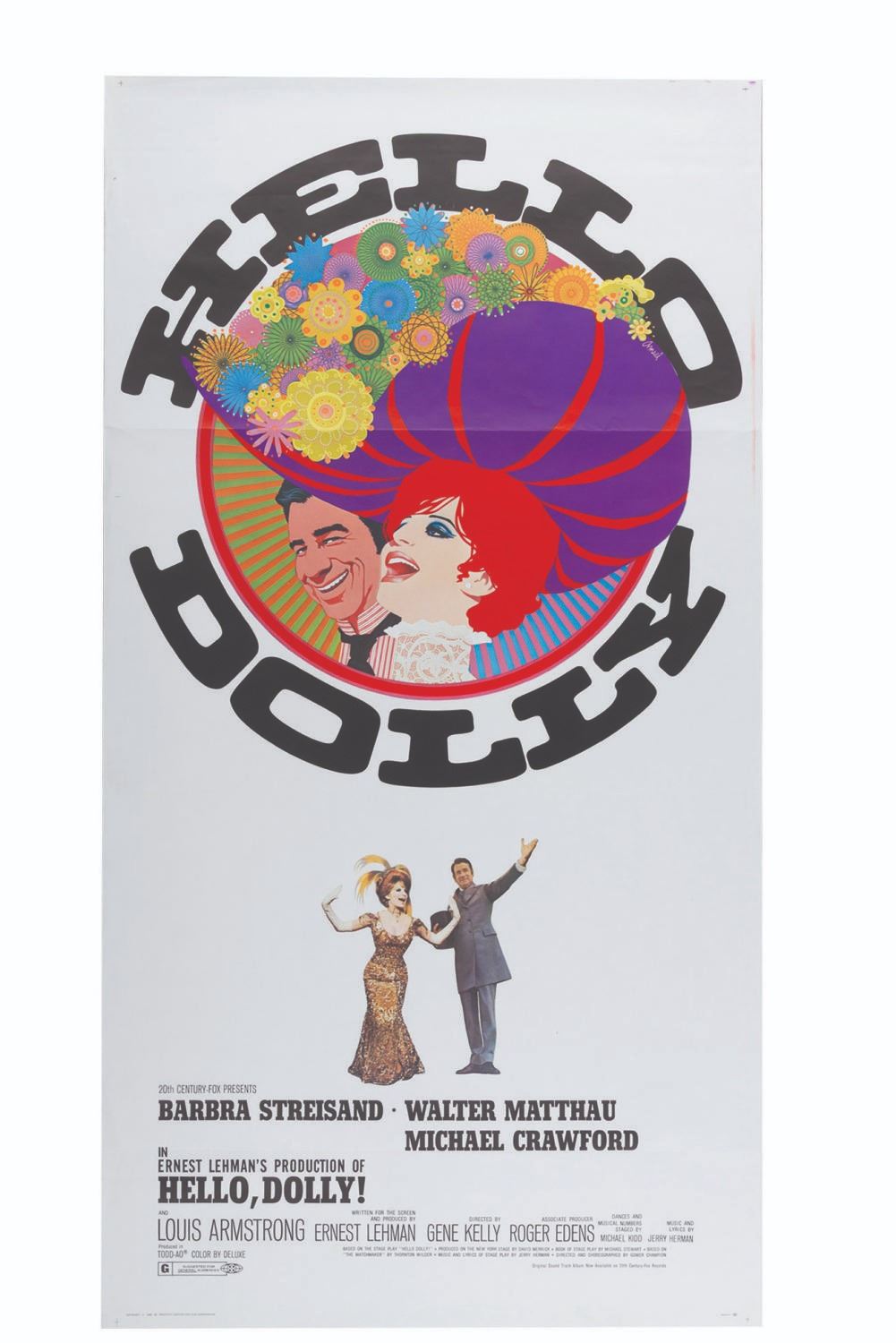 (20th Century Fox, 1969) An original three-sheet poster for the theatrical release of Gene Kelly’s “Hello, Dolly!” starring Barbra Streisand, Walter Matthau, and Michael Crawford. Measuring 41” x 77”, the poster is in very good condition with very light edge wear, a small tear to the upper left corner, and light strips of printing ink original to production on the far right and top edge, all of which do not affect the image.