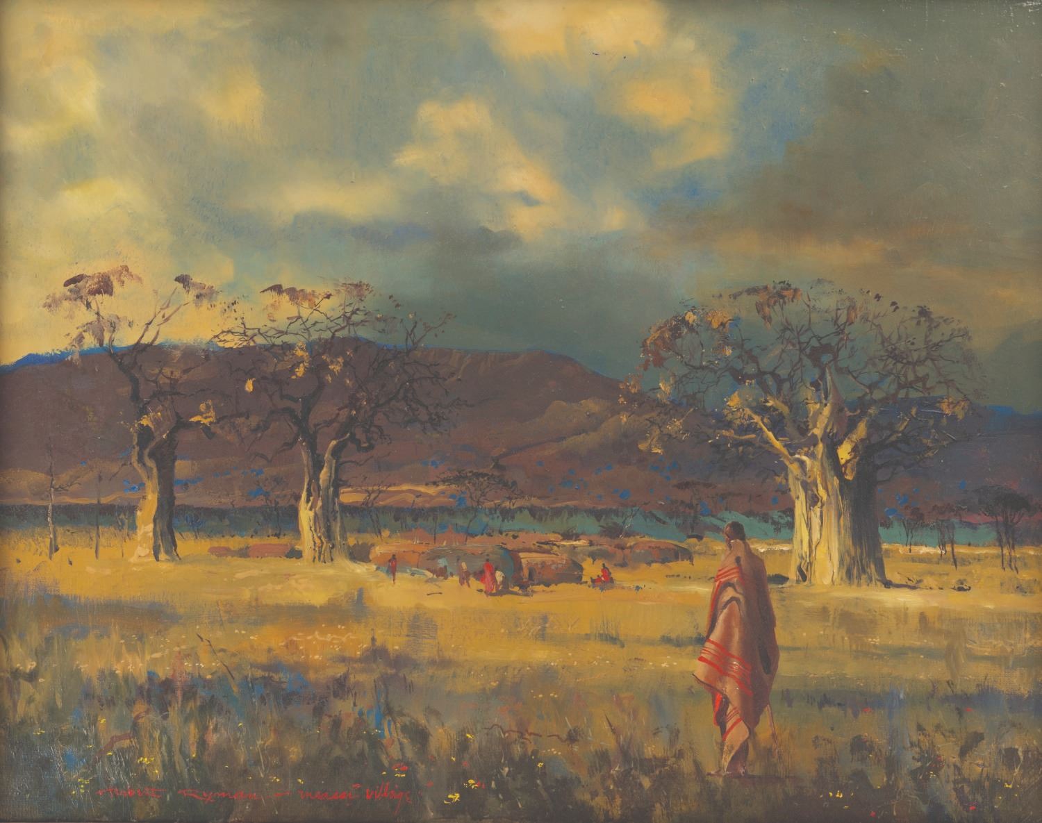 (Ryman, 1983) A beautiful oil on canvas painting of a Masai Village in Kenya, Africa. Ryman was a world traveler and would often paint scenes of the places he visited. This painting can be found on page 102 of "A Brush With Disney: An Artists Journey told through the words and works of Herbert Dickens Ryman" (Camphor Tree Publishers,2000) and was on exhibition at the Disneyland Gallery in late 2000. It measures 27"x22" and is displayed in a 36"x30" frame.