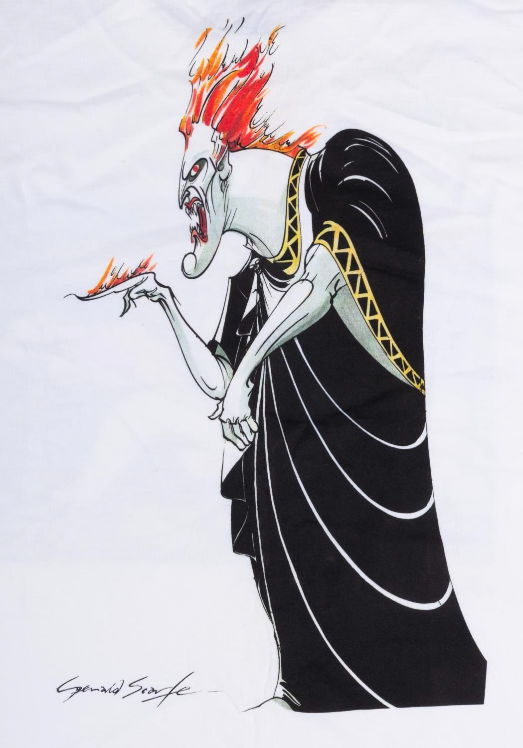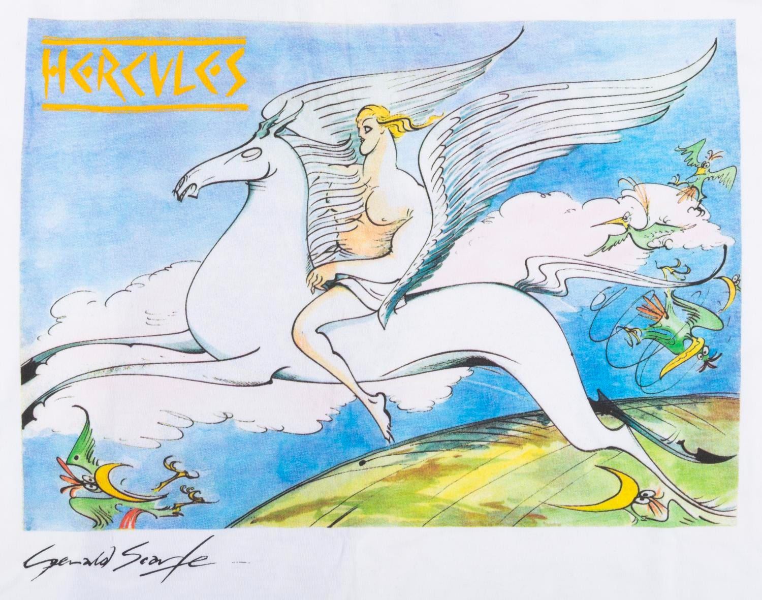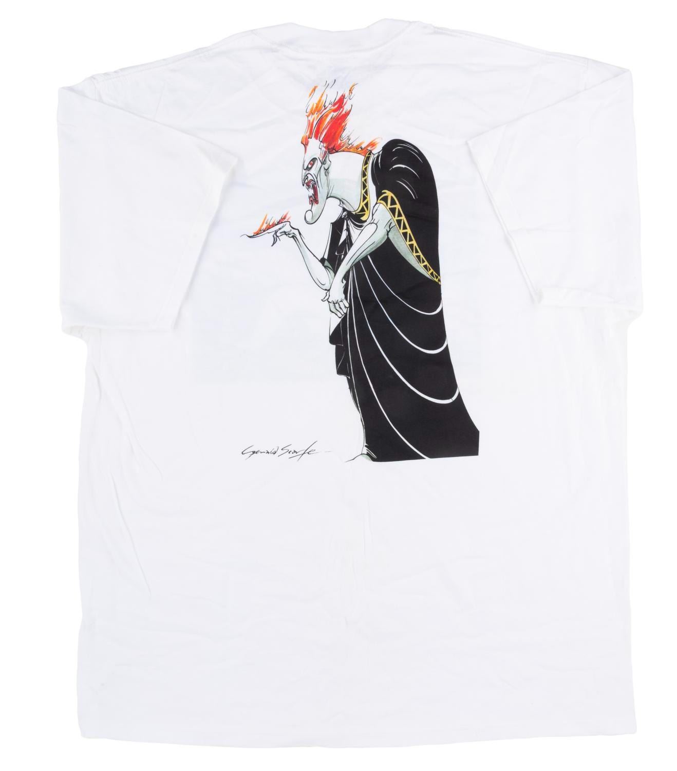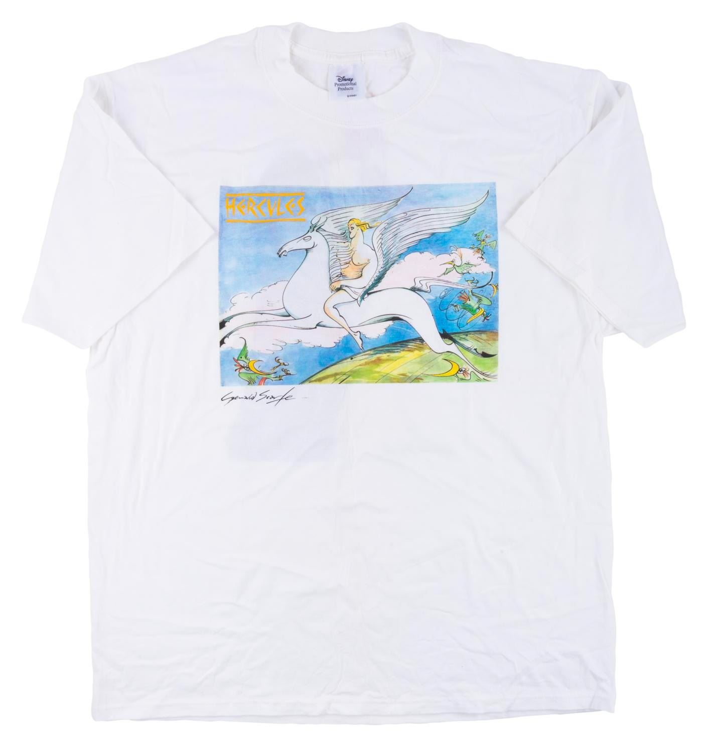 (Disney, 1997) A t-shirt featuring "Hercules " concept art by British cartoonist Gerald Scarfe, given to the crew who worked on the film. Hercules and Pegasus appear on the front of the shirt, with Hades on the back. Labeled a size XL, the shirt is in fine condition.