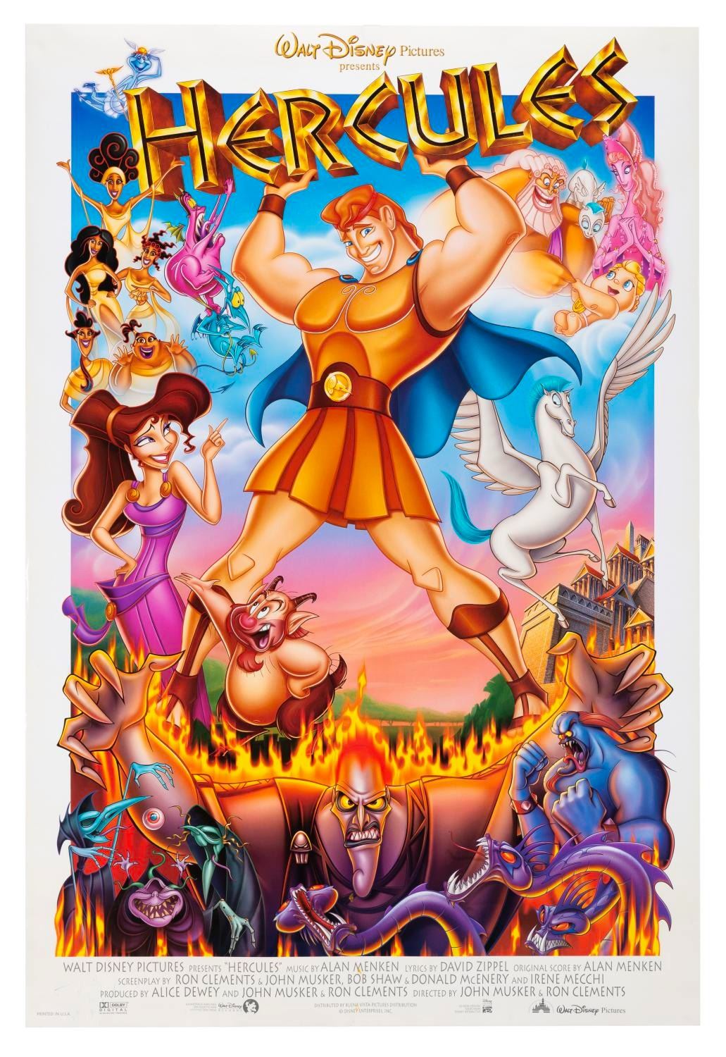 (Disney, 1997) A one-sheet for the original release of "Hercules." Measuring 27" x 40", the poster is in very good condition, with small scuffs in the lower left corner and two very small spots of rubber band residue in the bottom center text.