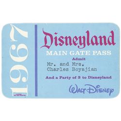 (Disneyland, 1967) A rare main gate pass that belonged to Disney Legend Charles "Chuck" Boyajian, who was the first manager of custodial o...