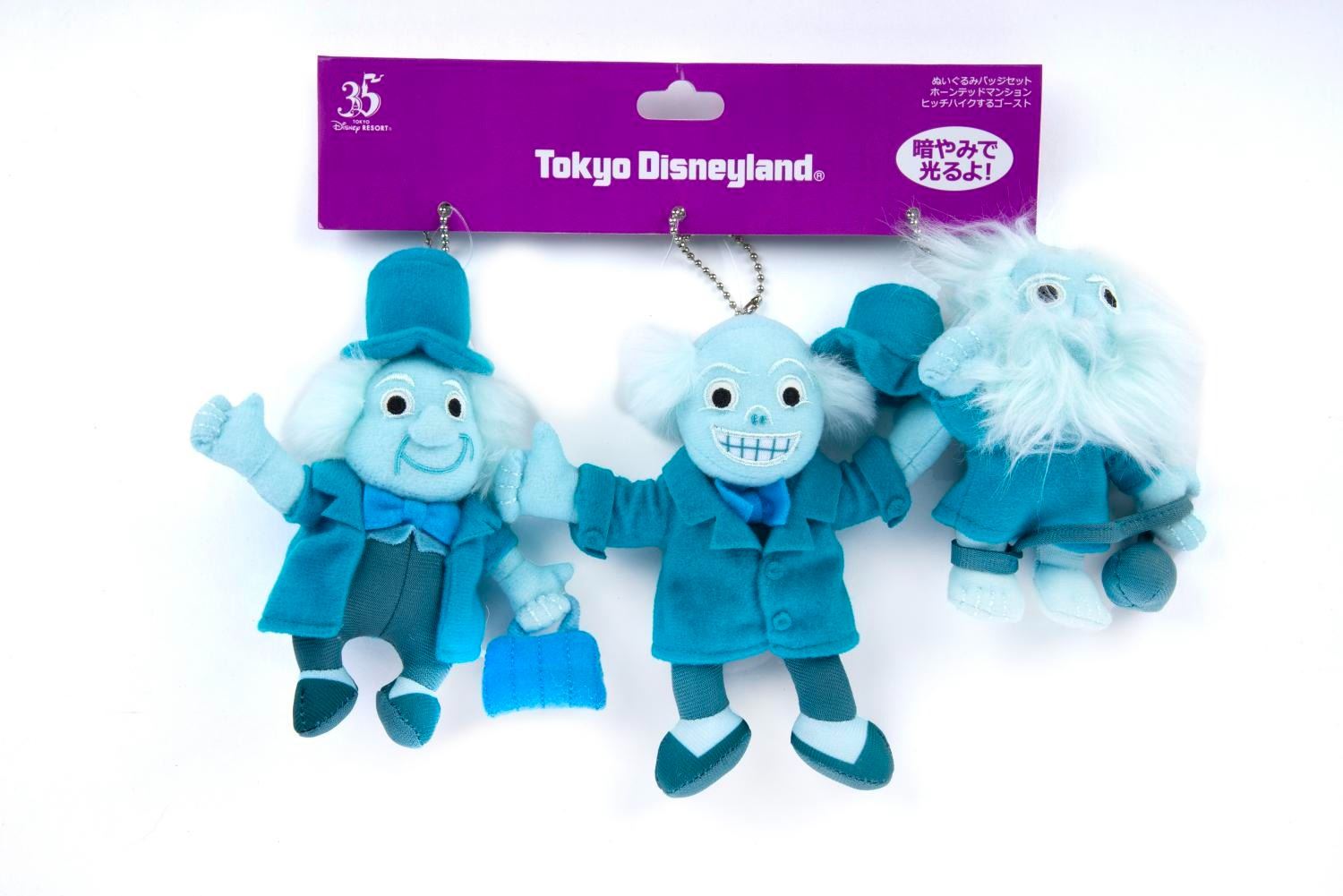 (Tokyo Disneyland, 2018-19) A Tokyo Disneyland Hitchhiking Ghosts Plush Bag Charm Set. Among this lot are (3) soft toy badges of Ezra, Phineas, and Gus, released exclusively for the 35th anniversary of Tokyo Disney Resort. Each one is in fine condition and attached to their original card.