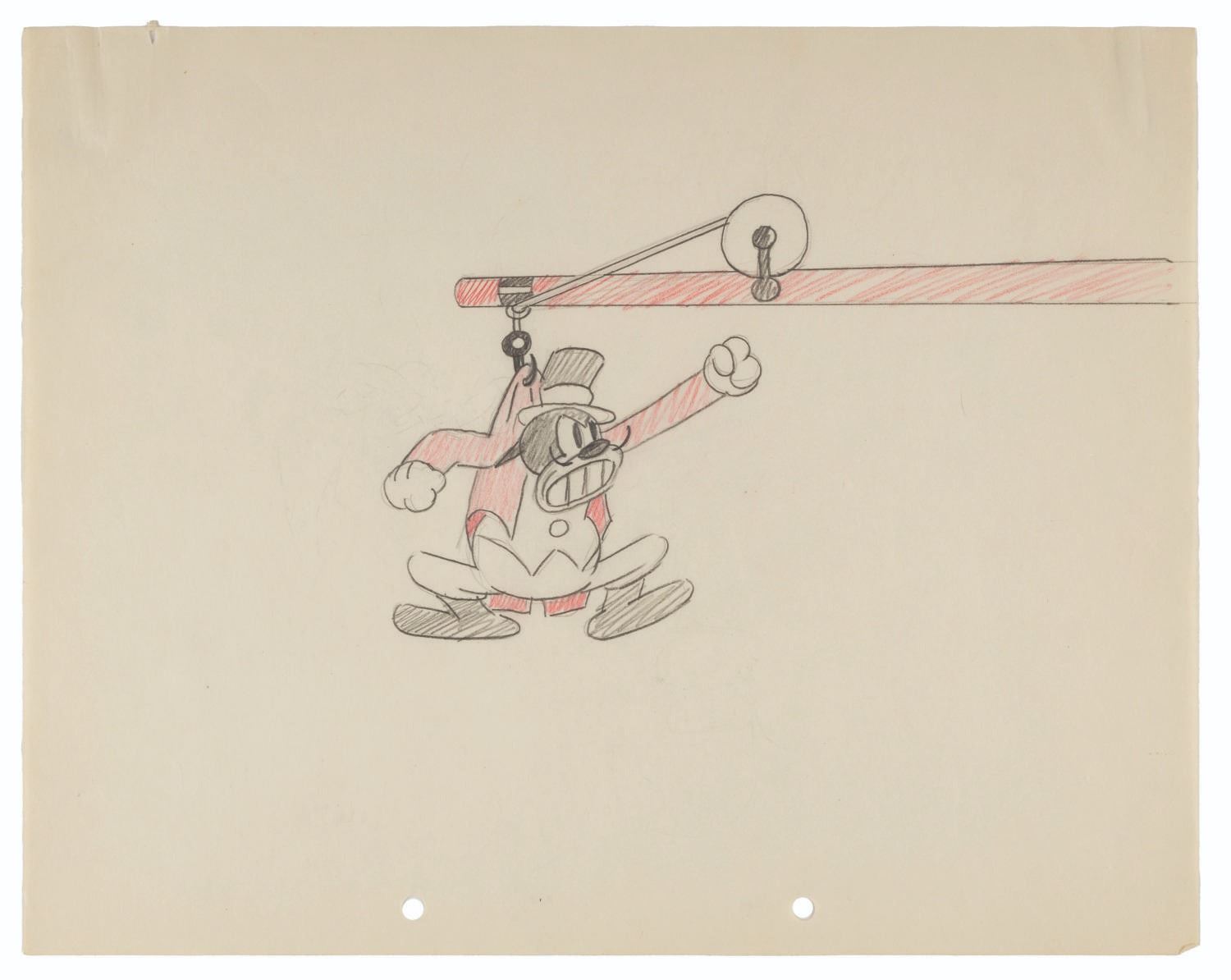 (Harman-Ising, 1931) A “Hittin’ the Trail for Hallelujah Land” storyboard drawing by Bob Clampett. The Piggy-starring short, directed by Rudolf Ising, was placed on the "Censored Eleven" list due to its use of racial stereotypes. With an image size of 5” x 8.5” on 9.5” x 12” animation paper, the graphite and colored pencil drawing displays in very good condition with light creases, edge wear, and a 0.25” tear.