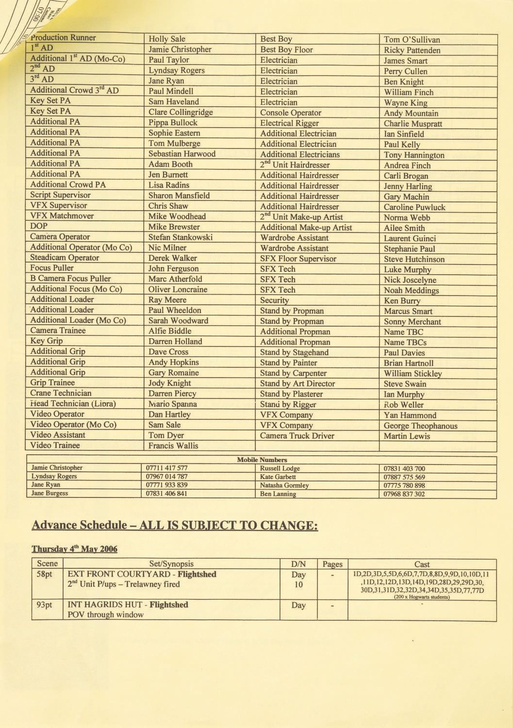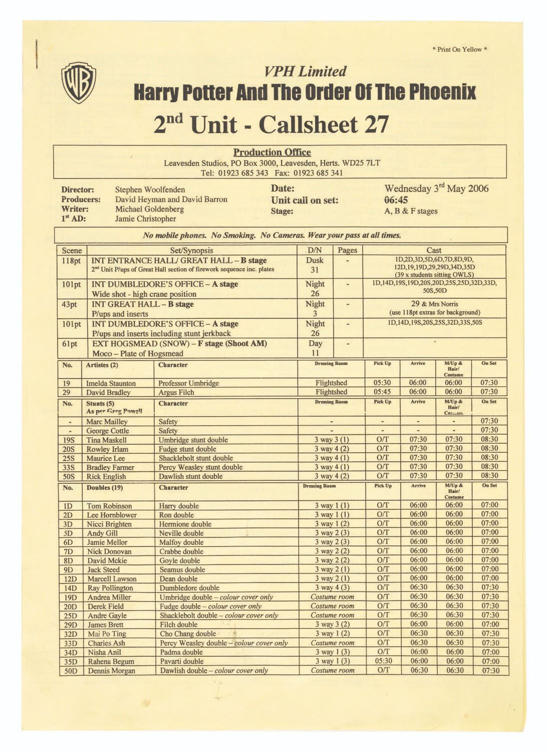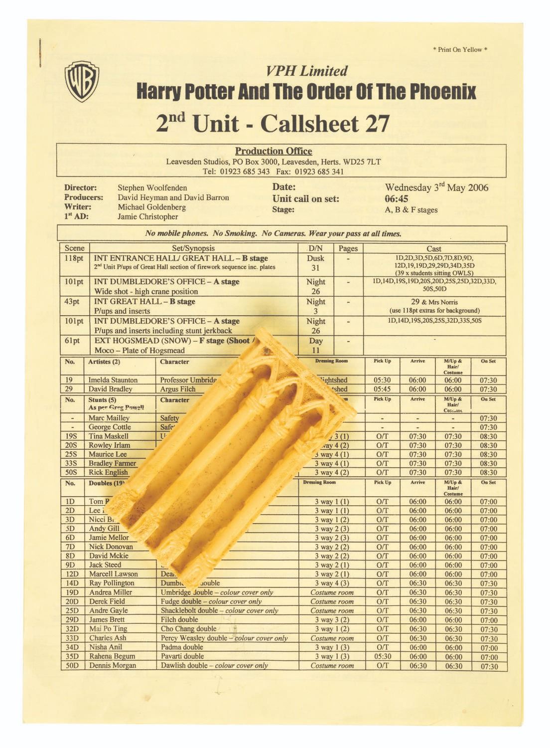 (Warner Bros., 2005) A miniature Hogwarts wall section casting and a seven-page call sheet from production of "Harry Potter and the Order of the Phoenix.” Dated May 3rd, 2006, the second unit call sheet is for scenes set in the Great Hall, Dumbledore’s Office, and an exterior of Hogsmeade. Measuring 4” x 2” x 0.5” thick, the casting is in very good condition with handling wear from production, while the 8.25” x 11.75” call sheet is in good production-used condition with edge wear and creasing from production use.