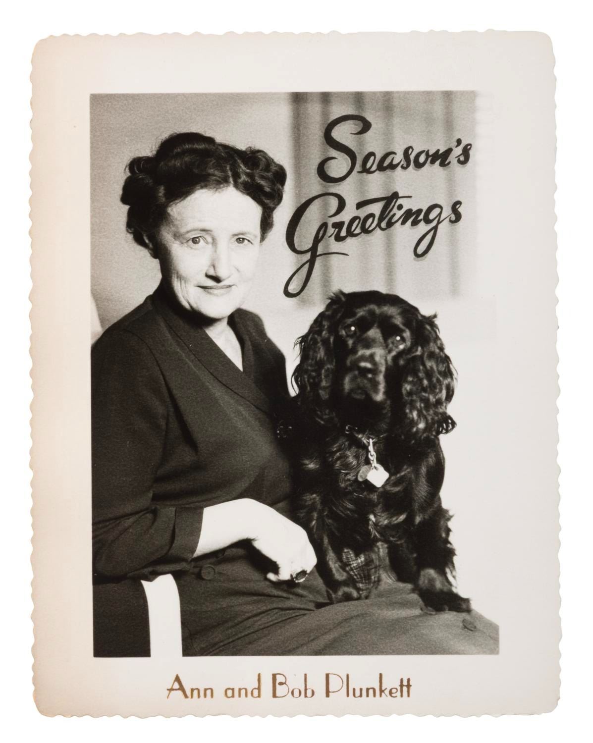 (Plunketts, 1950s-60s) A holiday greeting card from Ann and Bob Plunkett, featuring an adorable pooch. Bob Plunkett designed Disney postcards for the Tomorrowland Art Corner at Disneyland. Measuring 4.25" x 5.5", the greeting card is in very good condition with discoloration from age.