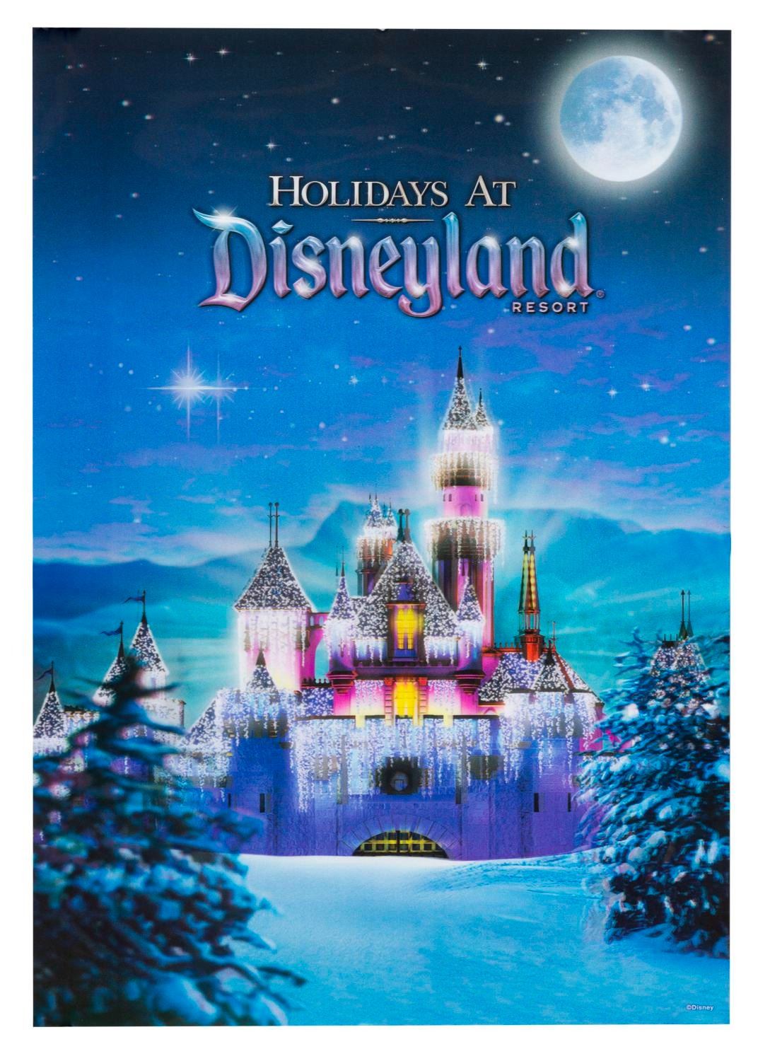(Disneyland, 2010) A Holidays at Disneyland lenticular poster featuring a festive Sleeping Beauty Castle decked in icicle lights. Measuring 18.5" x 26.5", the poster is in very good condition with light scratches and wear.