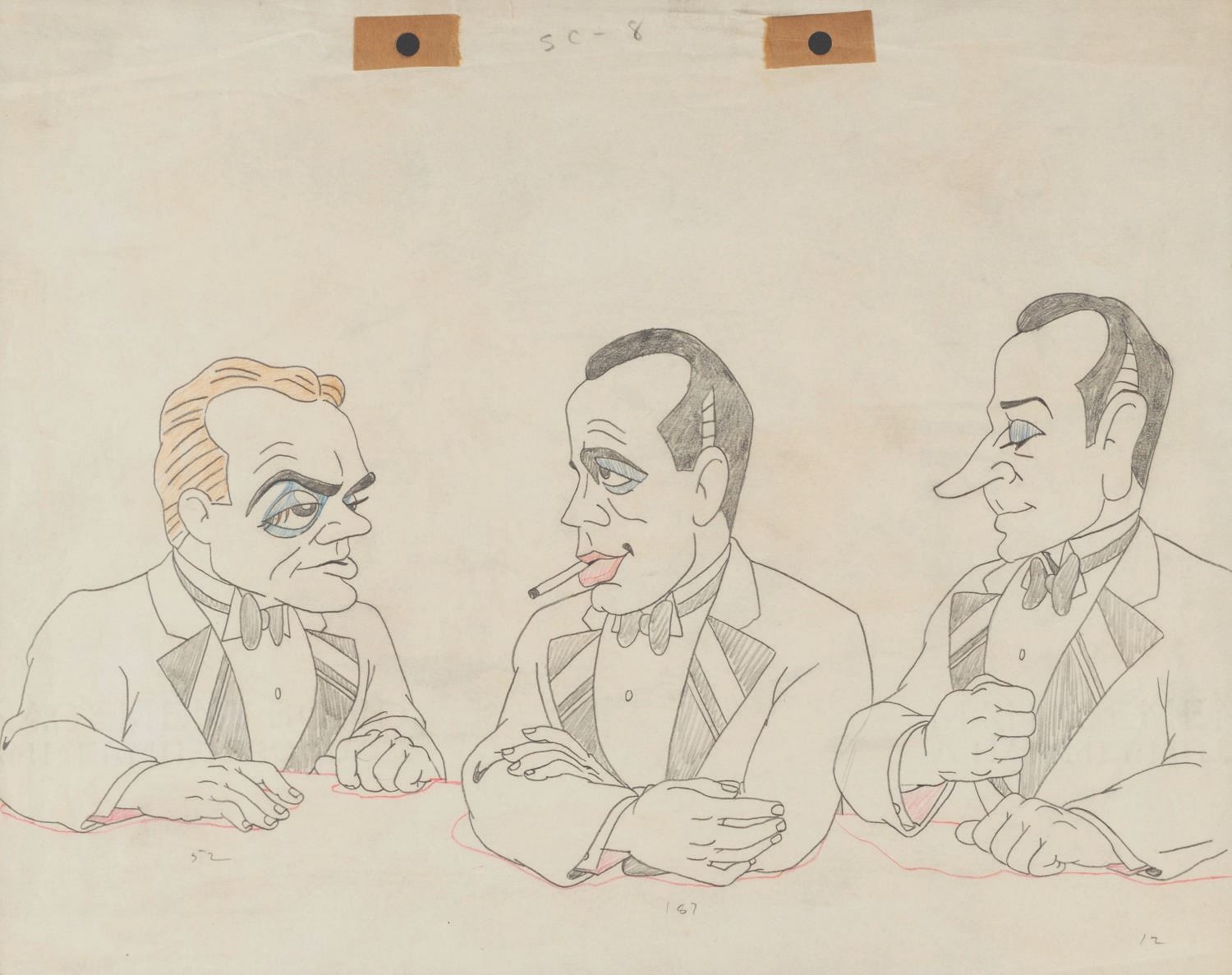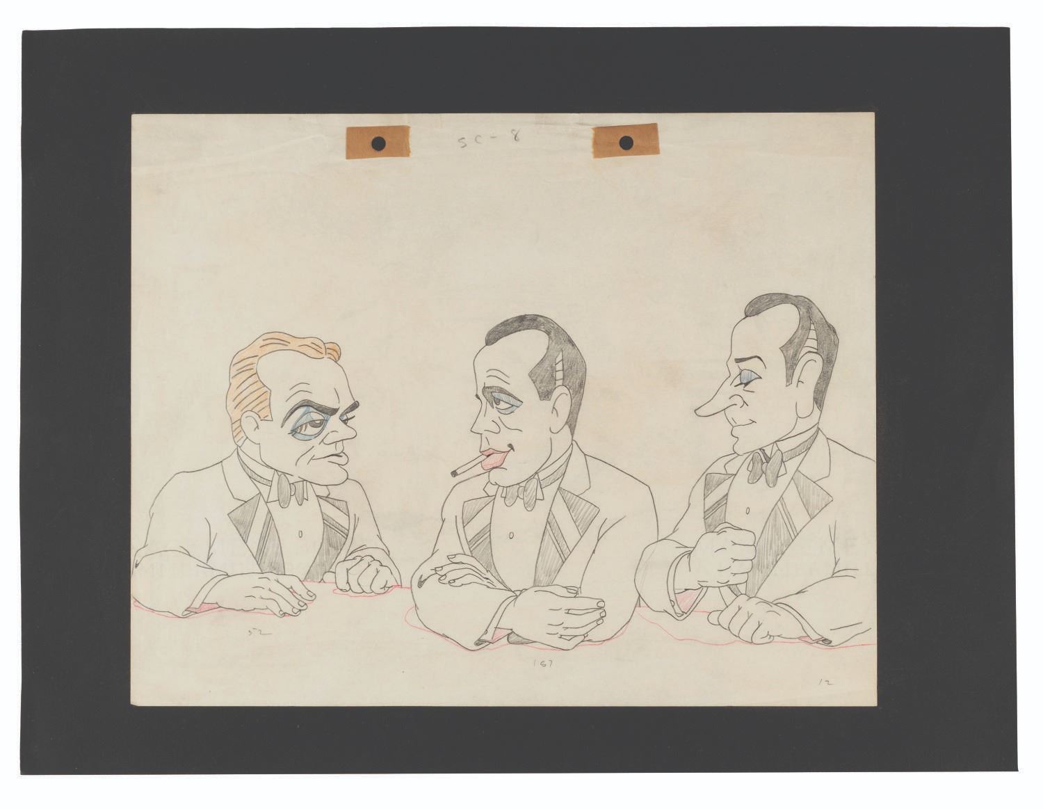 (Schlesinger, 1941) An original production drawing of James Cagney, Humphrey Bogart, and George Raft from the Merrie Melodies short “Hollywood Steps Out.” Accomplished in graphite and colored pencil, with a 6” x 12” character image size on 9.5” x 12” animation paper, the drawing is in very good condition with light creasing and edge wear from production use and light discoloration from age.