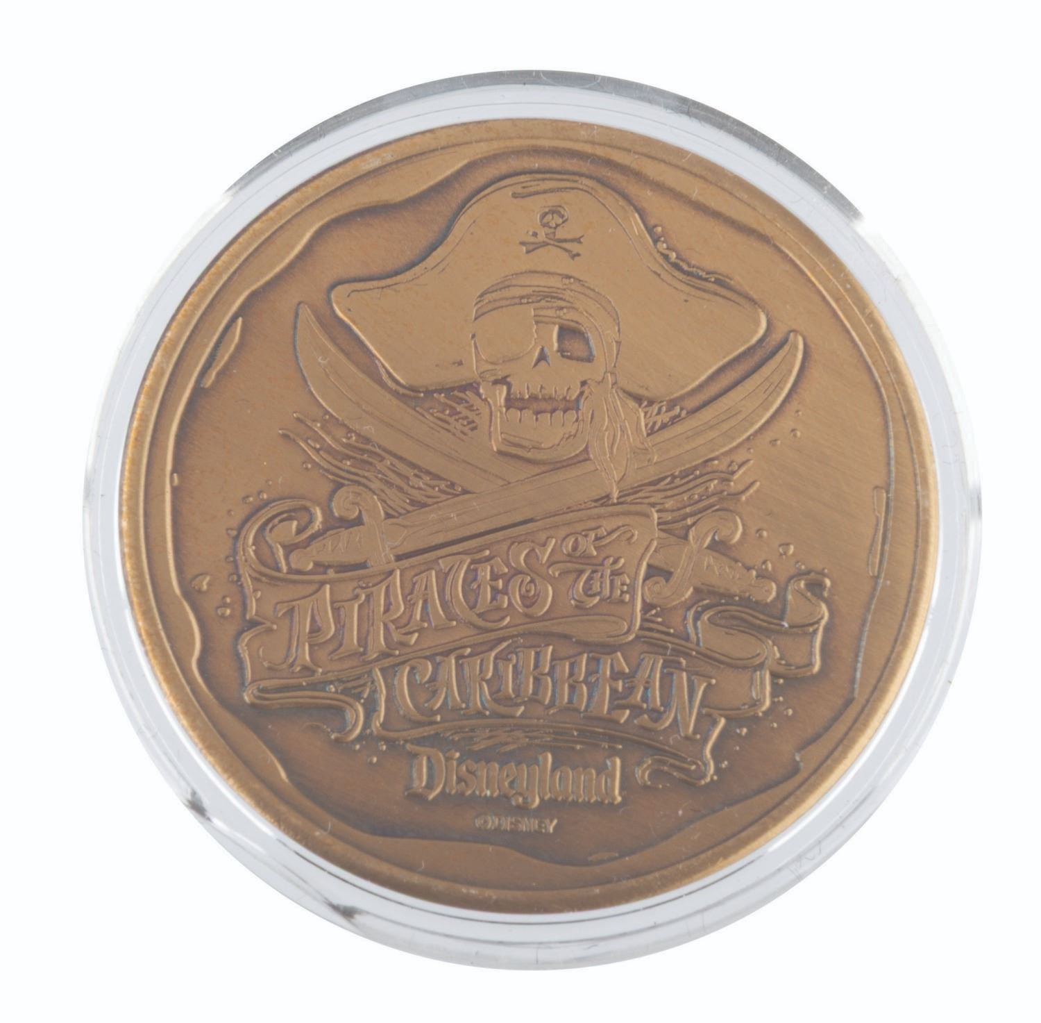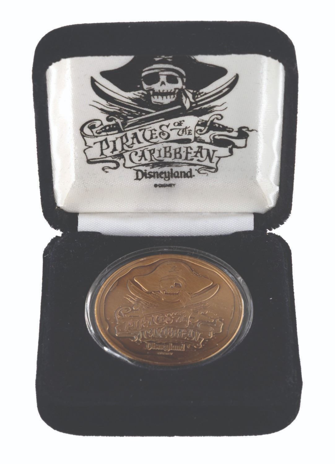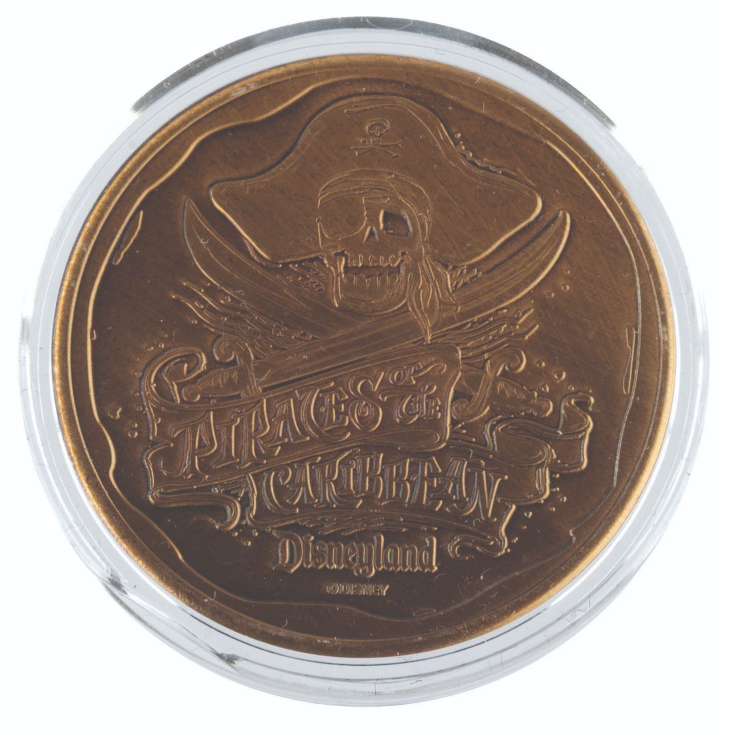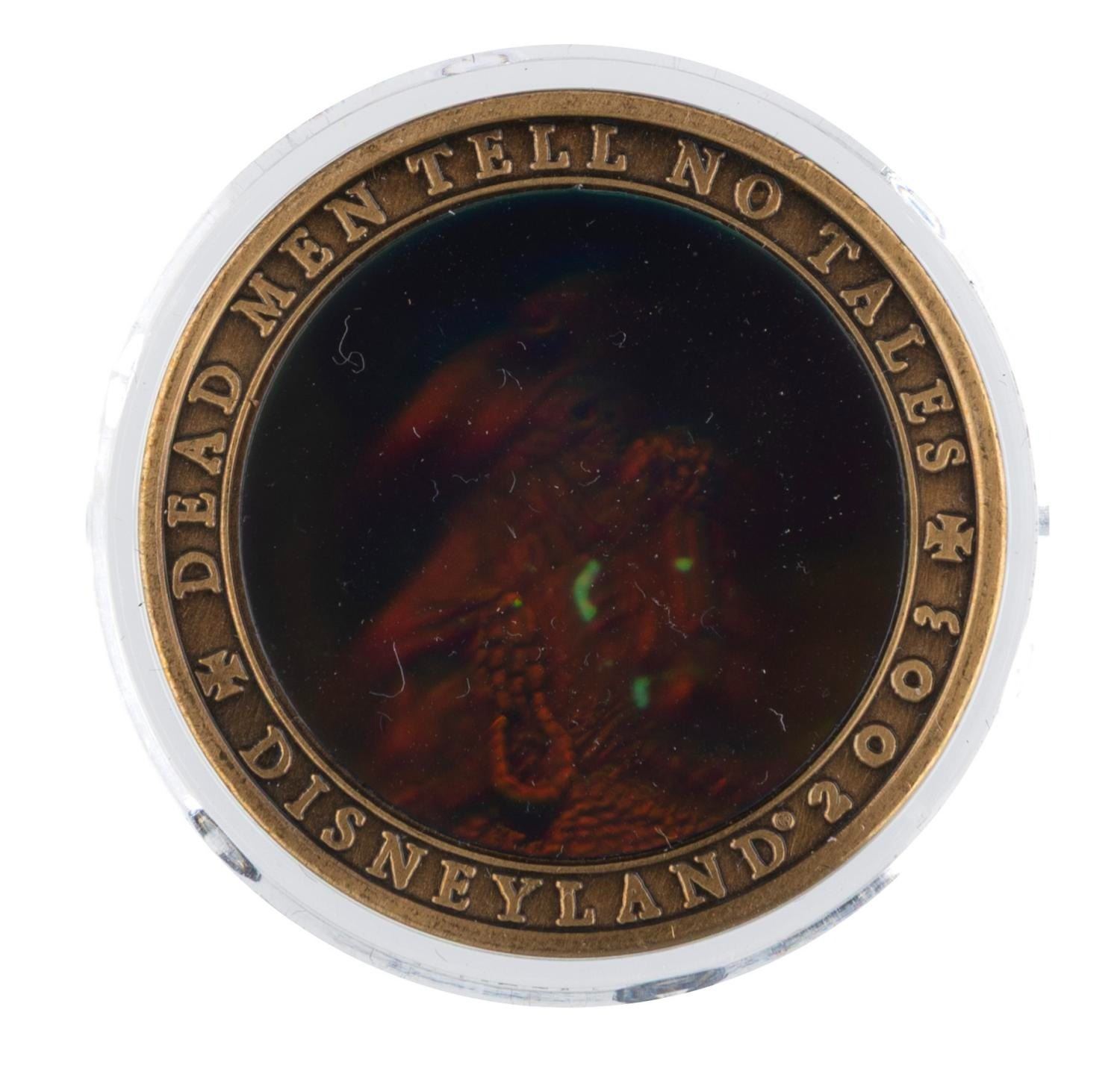 (Disneyland, 2003) A holographic coin created for a "Dead Men Tell No Tales" event in 2003. The coin features the holographic image of a pirate skeleton, with the attraction logo on the back side. The coin comes in a clear protective case and a velvet display box. The set is in fine condition.