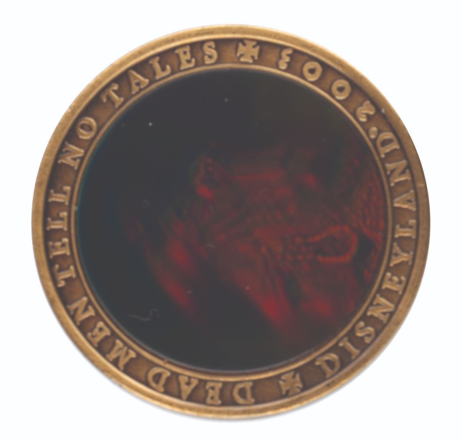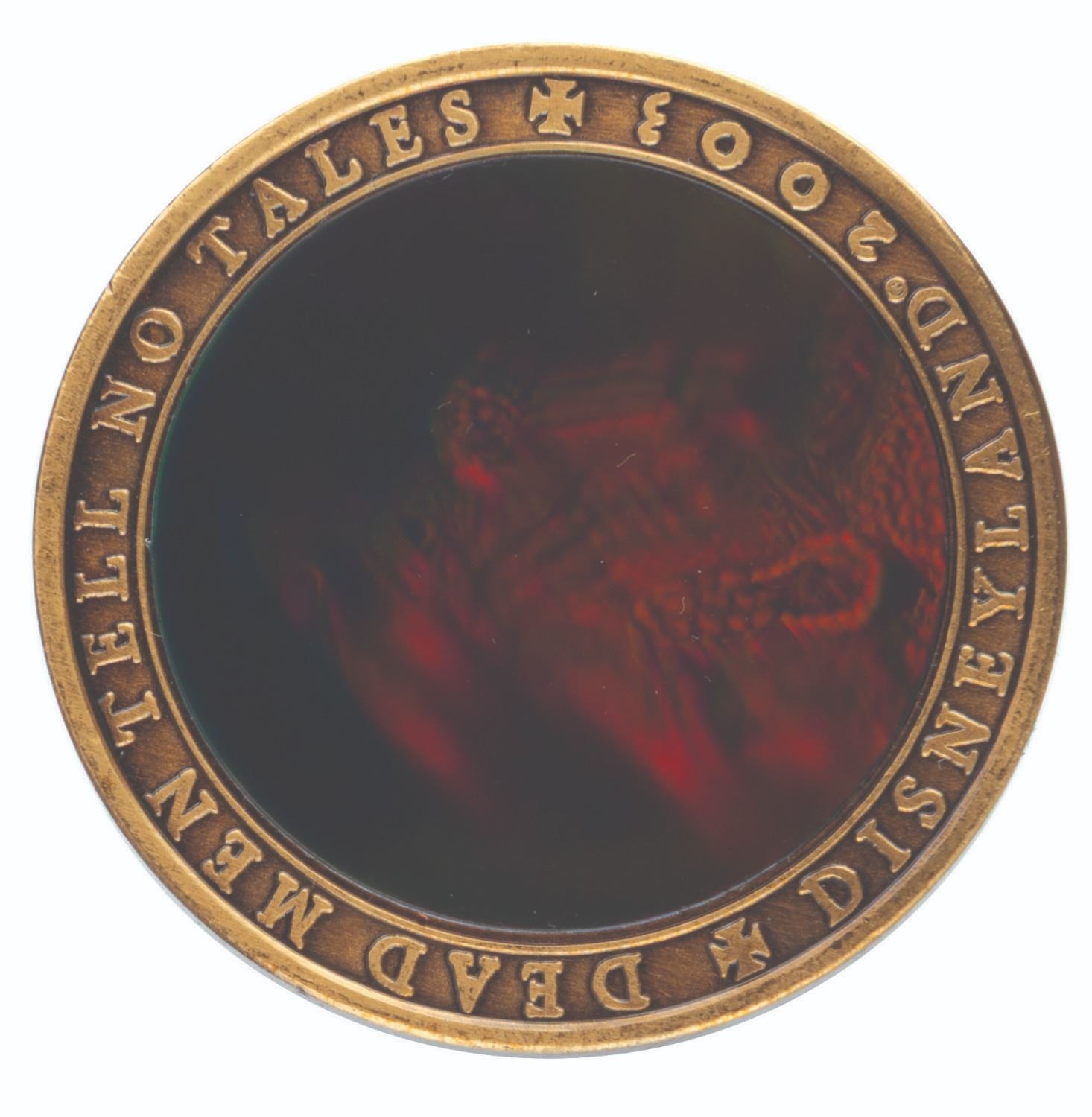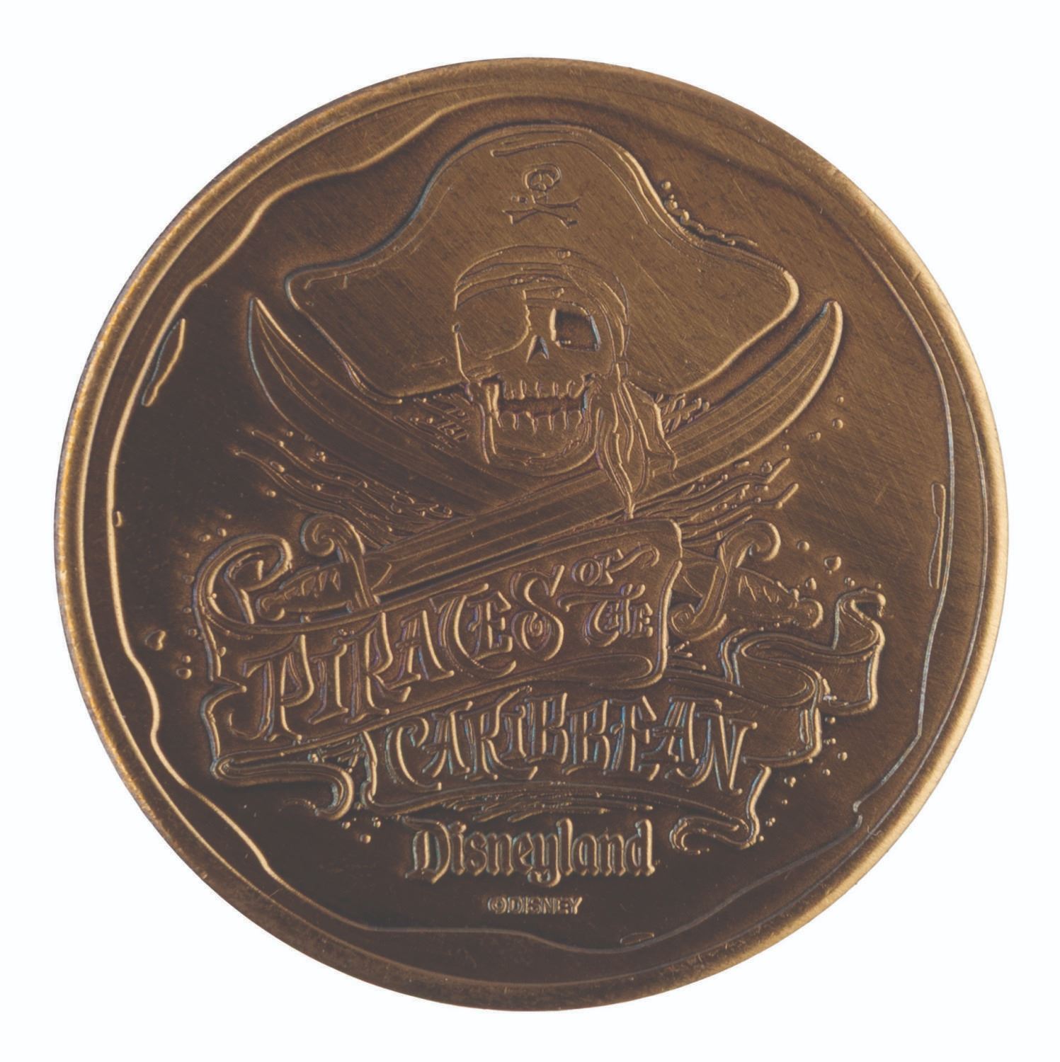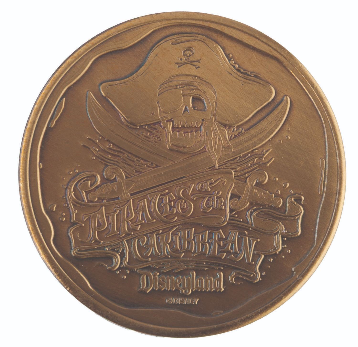 (Disneyland, 2003) A holographic coin created for a "Dead Men Tell No Tales" event in 2003. The coin features the holographic image of a pirate skeleton, with the attraction logo on the back side. The coin comes in a clear protective case and a velvet display box. The set is in fine condition.