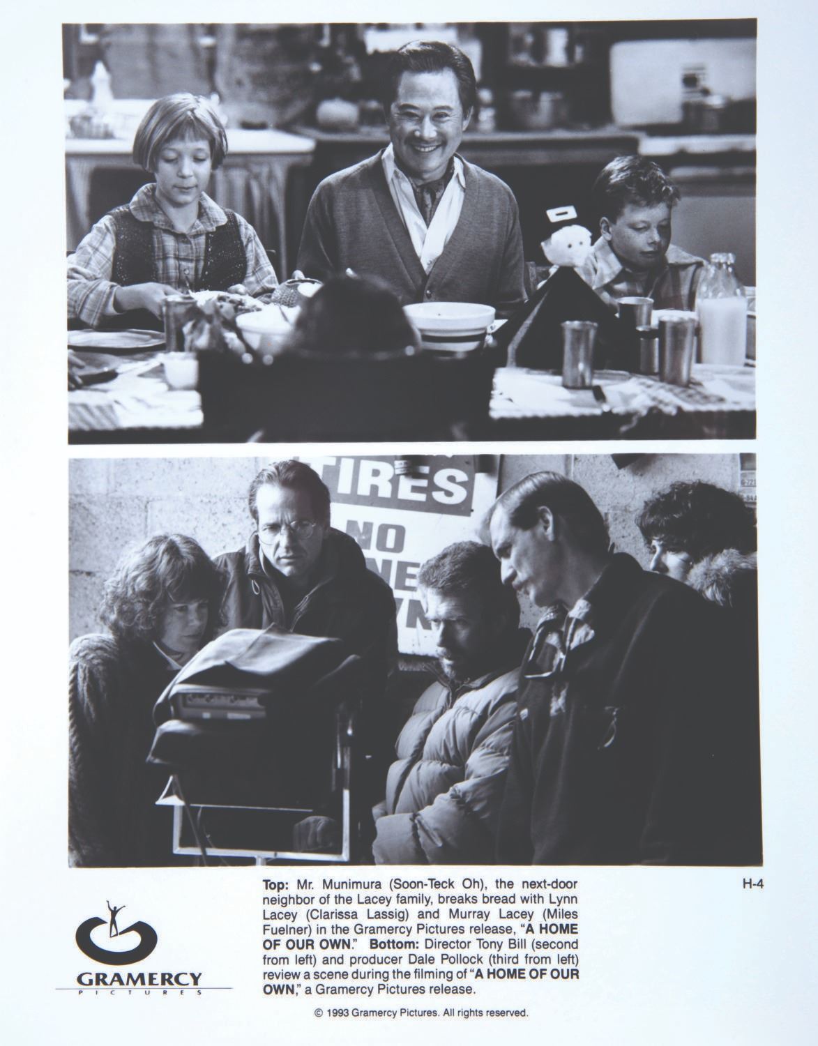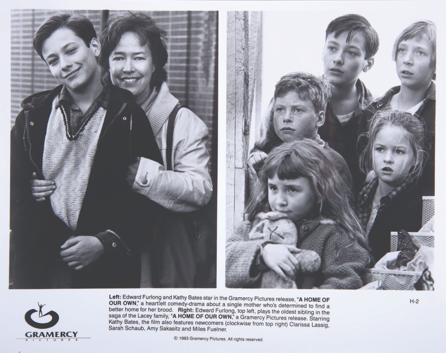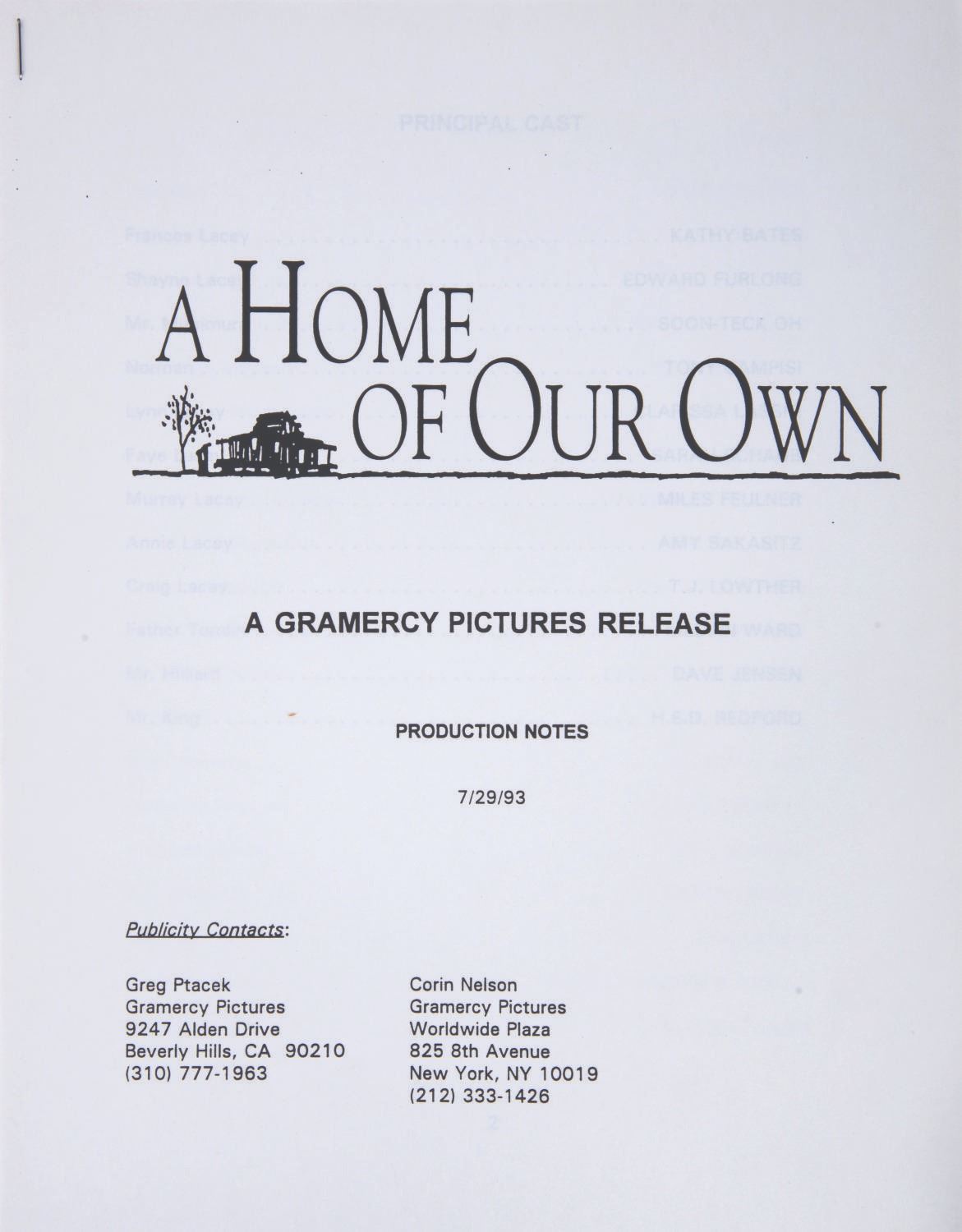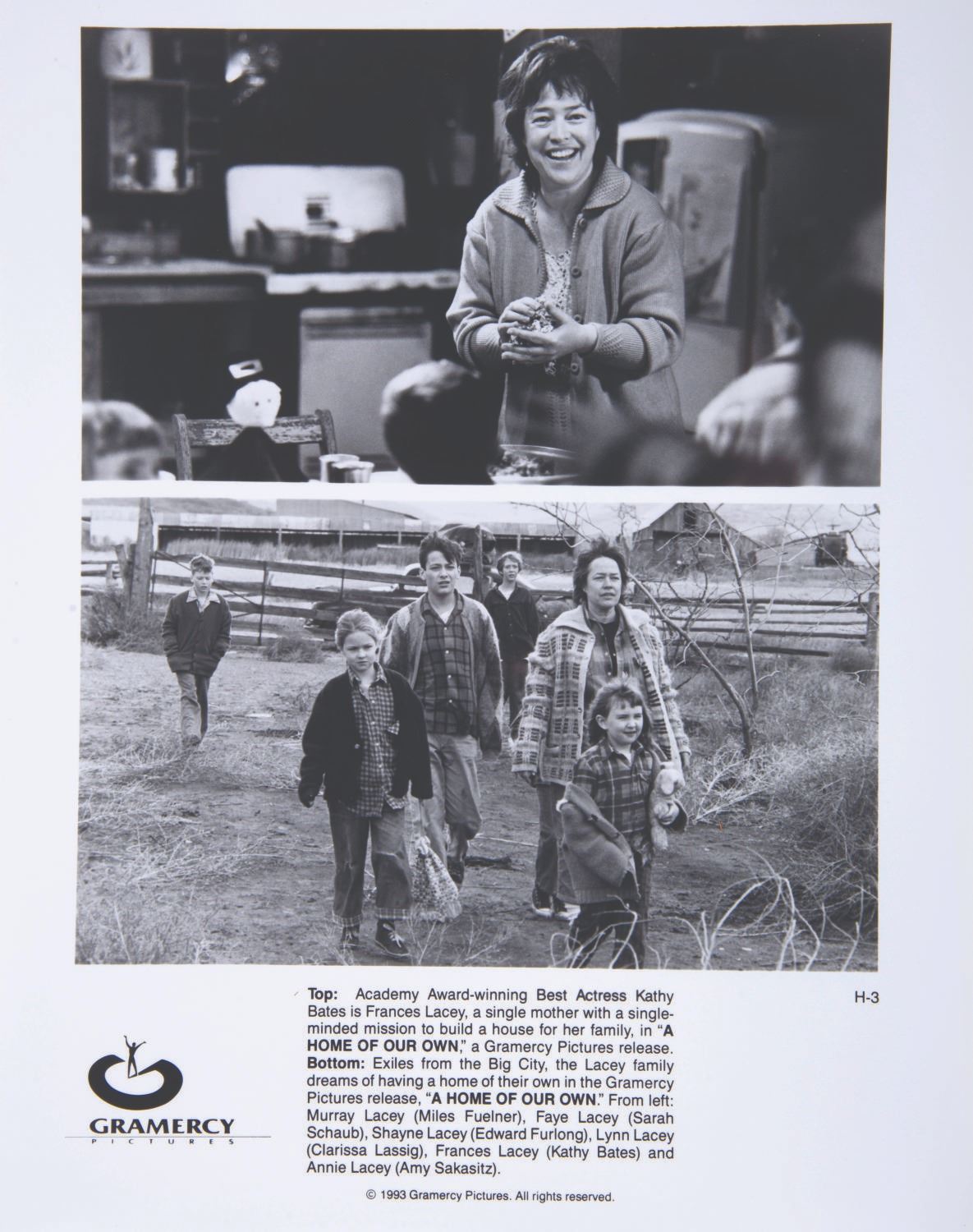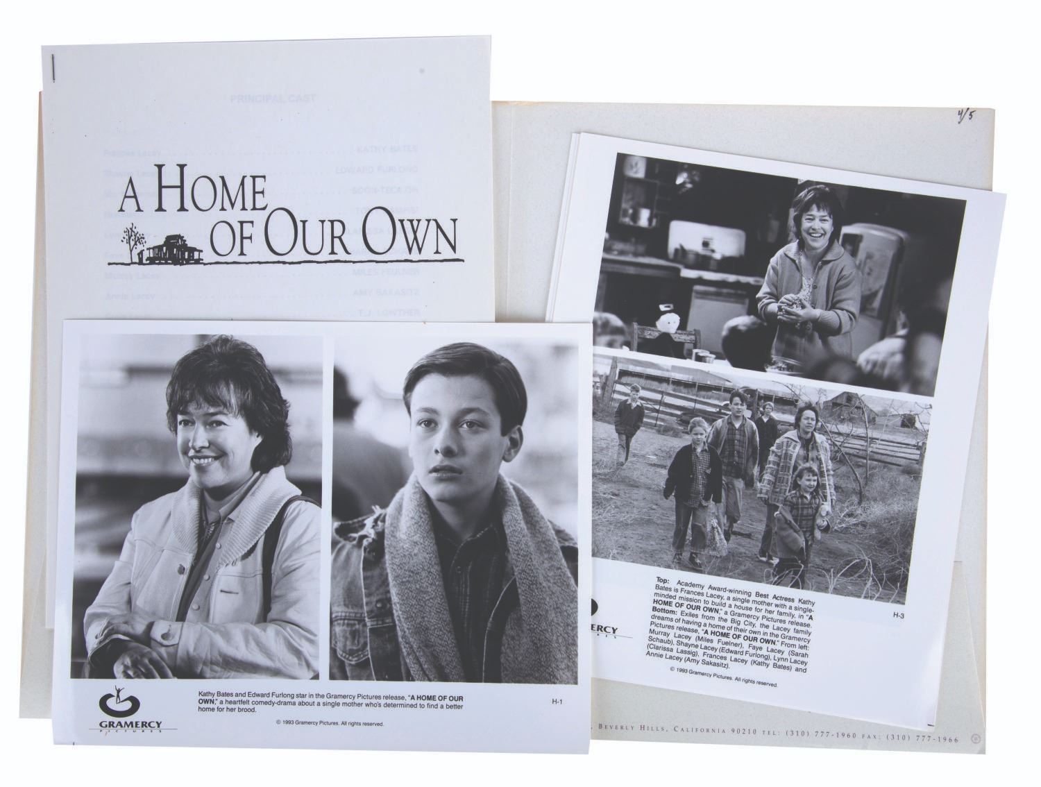 Gramercy Pictures, 1993) A Press Kit for the film A Home of Our Own starring Kathy Bates and Edward Furlong. The folder includes the film's production book, and (4) 2-up publicity stills with a total of (8) images. Measuring 9"x11.5", the press kit is in very good condition, with a scuff and light handling wear to the folder only.