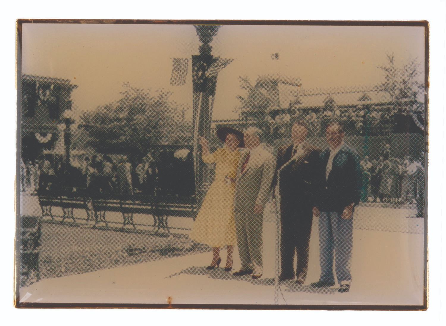 (Ape Pen, 2005) A pin featuring the cover image from the book Homecoming: Destination Disneyland by Carlene Thie. The pin was released in a limited edition of 500. Measuring 1.25” x 1.75” the pin is in good condition with light surface scratches, discoloration, and wear on the reverse.