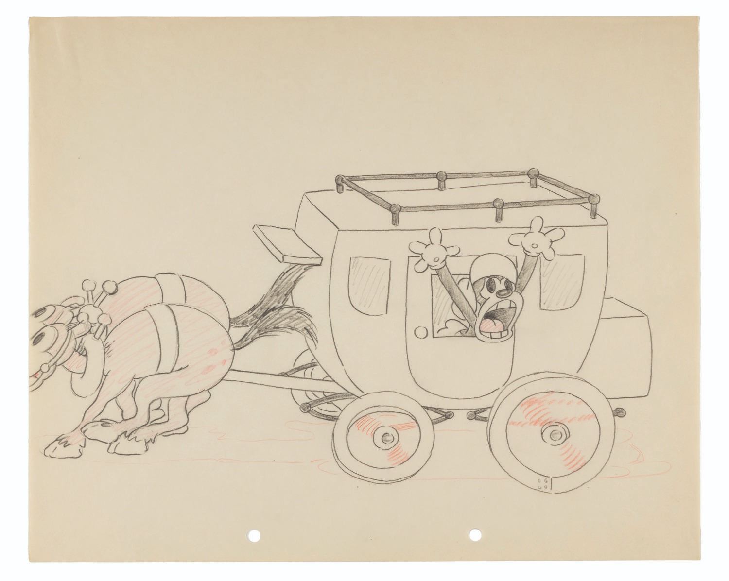 (Harman-Ising, 1932) An original storyboard drawing featuring Honey from the Looney Tunes short “Ride Him, Bosko!” Accomplished in graphite and colored pencil and measuring 9.75” x 12” with a character image size of 5.5” x 11.25”, the drawing is in fine production-used condition with light edge wear and light discoloration from age.