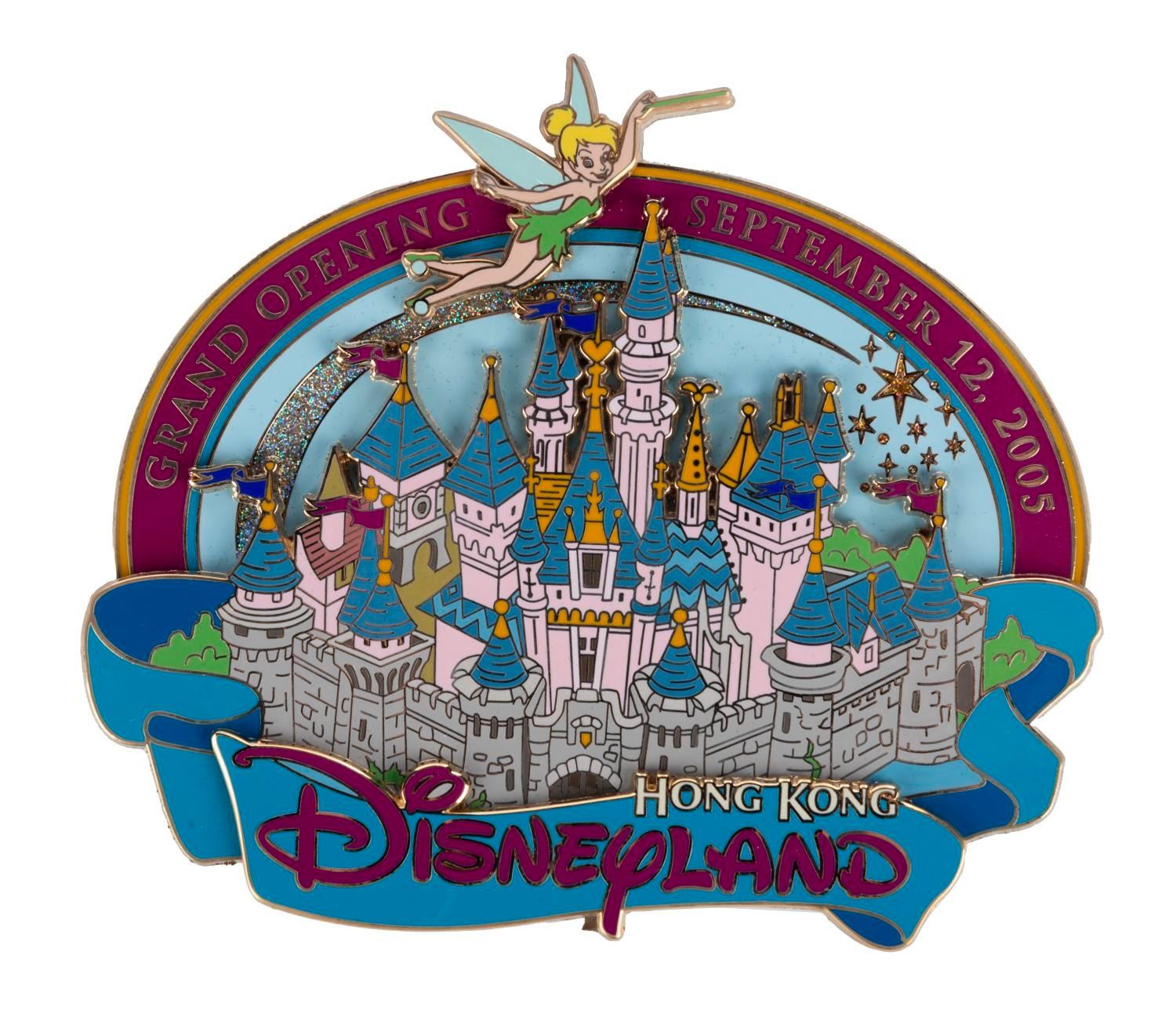 (Hong Kong Disneyland, 2005) A 3-D jumbo pin offered to Cast Members and commemorating the Grand Opening Day of Hong Kong Disneyland. The Cast Member-only pin was limited to an edition of 1,000. Measuring 4.75"x4.25", this pin is in fine condition with its original 6"x6.25" box.