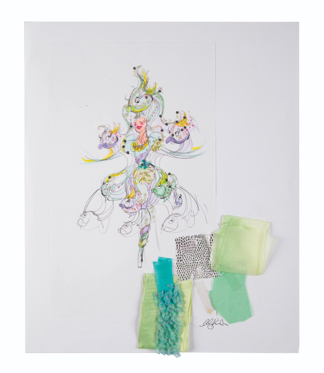 (Hong Kong Disneyland, 1999) A “Little Mermaid” inspired character costume design for the Under the Sea sequence of The Golden Mickeys show at Hong Kong Disneyland, by artist Alyja Kalinich. Accomplished in graphite, ink, and marker on 8.5" x 14" drawing paper, the artwork has been mounted to 14" x 17" cardstock with suggested fabric samples attached. The artwork is signed by the artist and displays in good condition with light edge wear, creasing, and an exposed piece of double-sided tape.