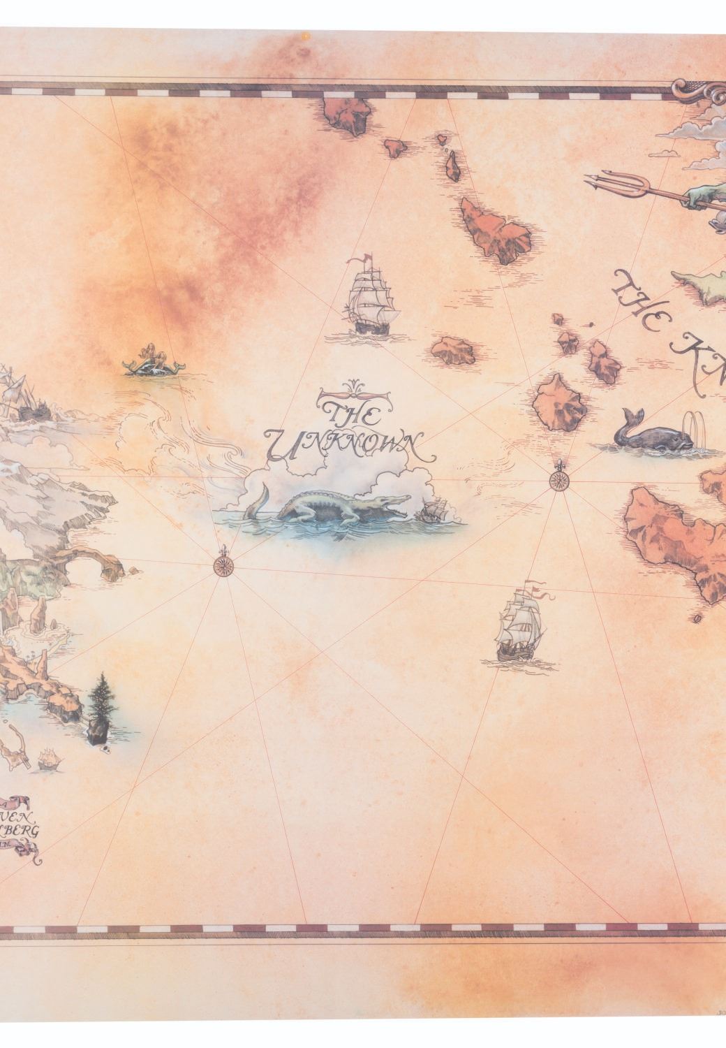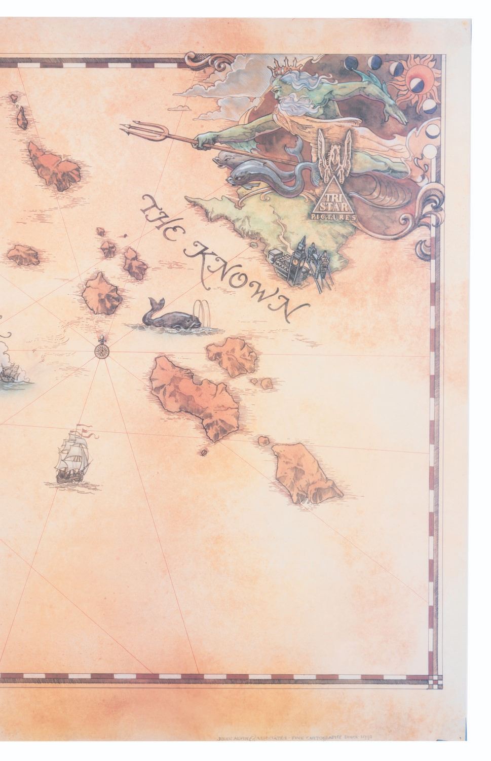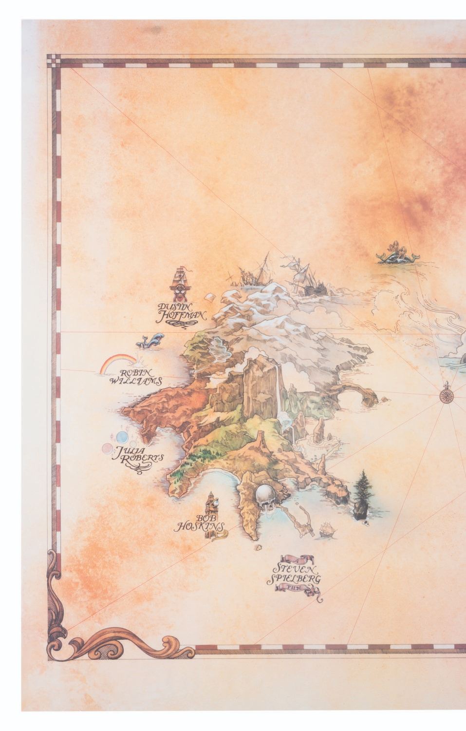 (TriStar, 1991) A large prop map created for the “Hook” teaser trailer. In the trailer, a magnifying glass moves across the map, revealing the names of the lead actors, until it reaches the Lost Boys’ hideout. The map burns in the trailer, so this is an unused hero prop. Measuring 40.75” x 60”, the map displays in very good condition with creases and edge wear.
