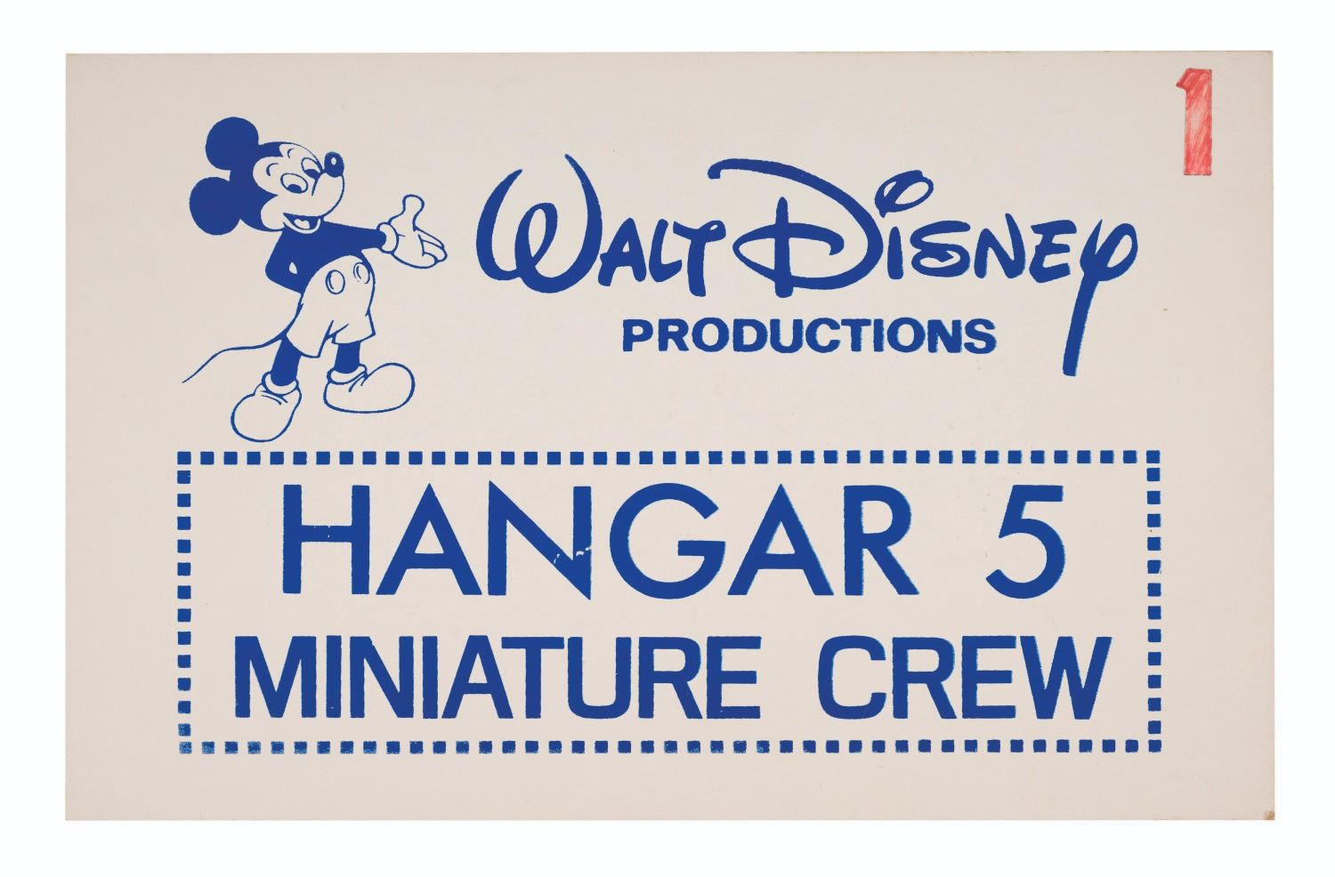 (EPCOT Center, 1982-83) A Horizons Crew Sign. Miniature models and sets were so great in size that they required large spaces to house them during production, including a local Burbank Airport hangar. This Walt Disney Productions sign was used to identify a location used by "Hangar 5 Miniature Crew." Measuring 11"x7", the cardstock sign is in very good condition with mild expected wear from handling and age.