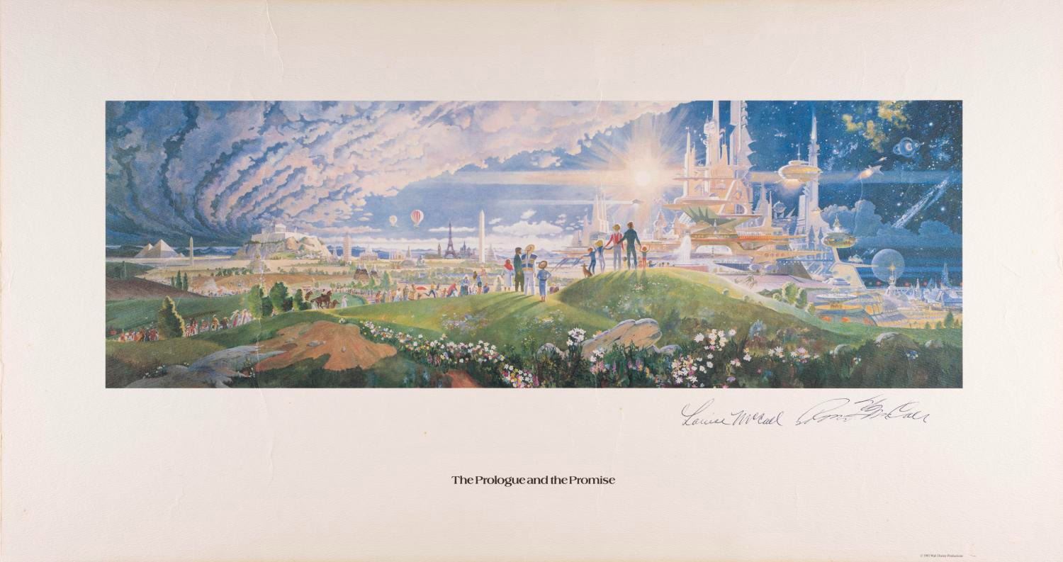 (EPCOT) A print of the "Prologue and Promise" mural in the Horizons Pavilion at EPCOT signed by the two artists, Robert and Louise McCall. The piece is in very good used condition.