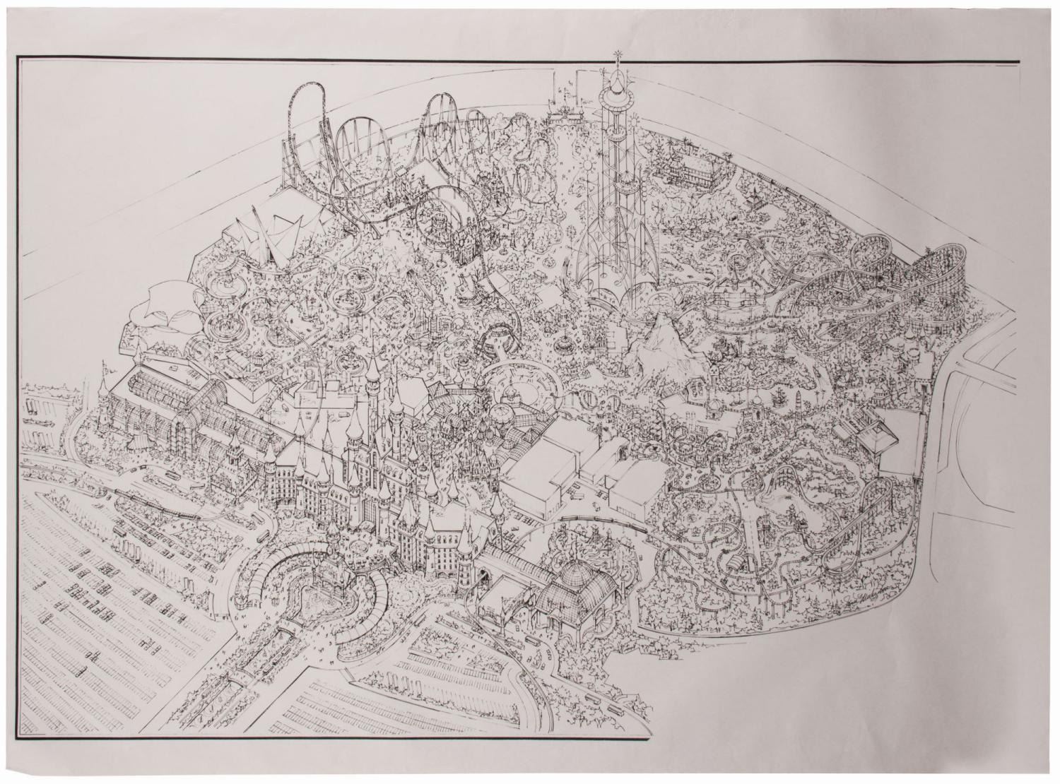 (Legacy Entertainment, 2009) A large concept art map print for the Hot Go Dreamworld theme park in Fuchun, China. With elements such as a Shanghai Disneyland castle clone, the map shows a hugely ambitious layout, but the Park itself remains unopened, under construction since 2015. Measuring 36" x 50", the print is in good condition overall with some minor creasing and handling wear from use.