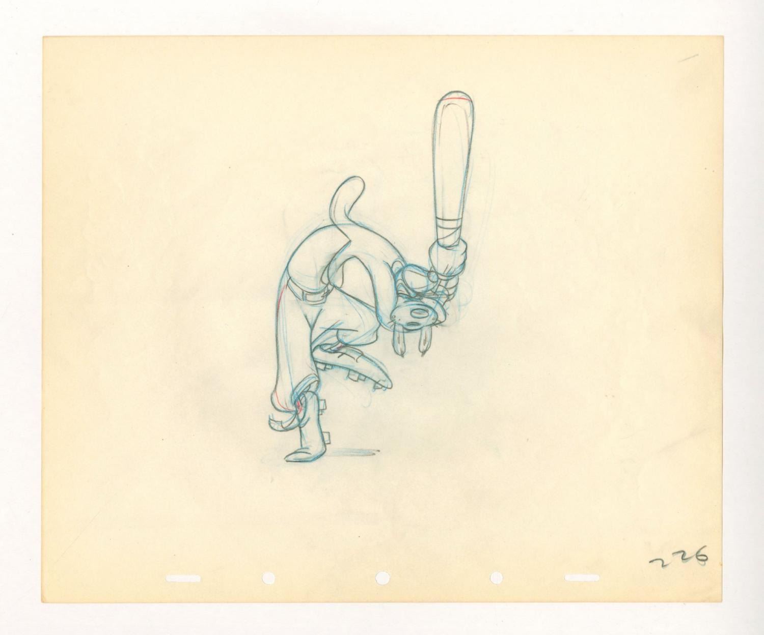 (Disney, 1942) A graphite and color pencil production drawing of Goofy from the animated short "How to Play Baseball." Goofy has an image size of 3.5" x 6.75" on 10" x 12" animation paper, in very good condition with minor wear and wrinkling along the left side.