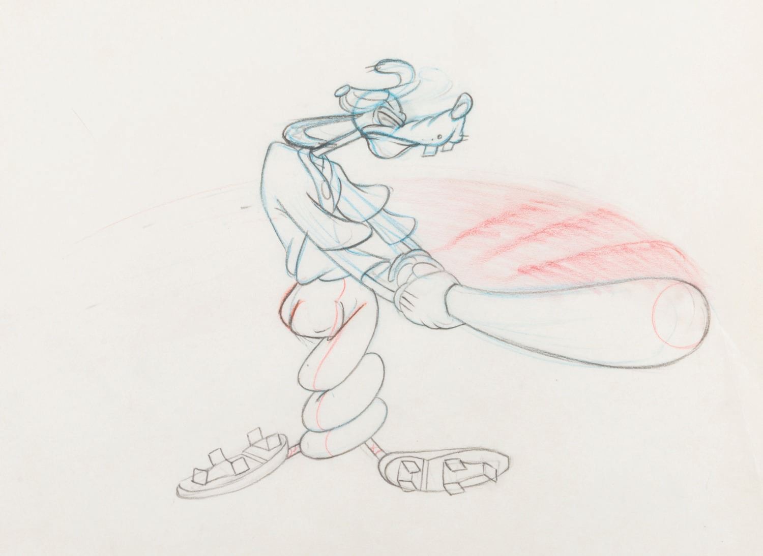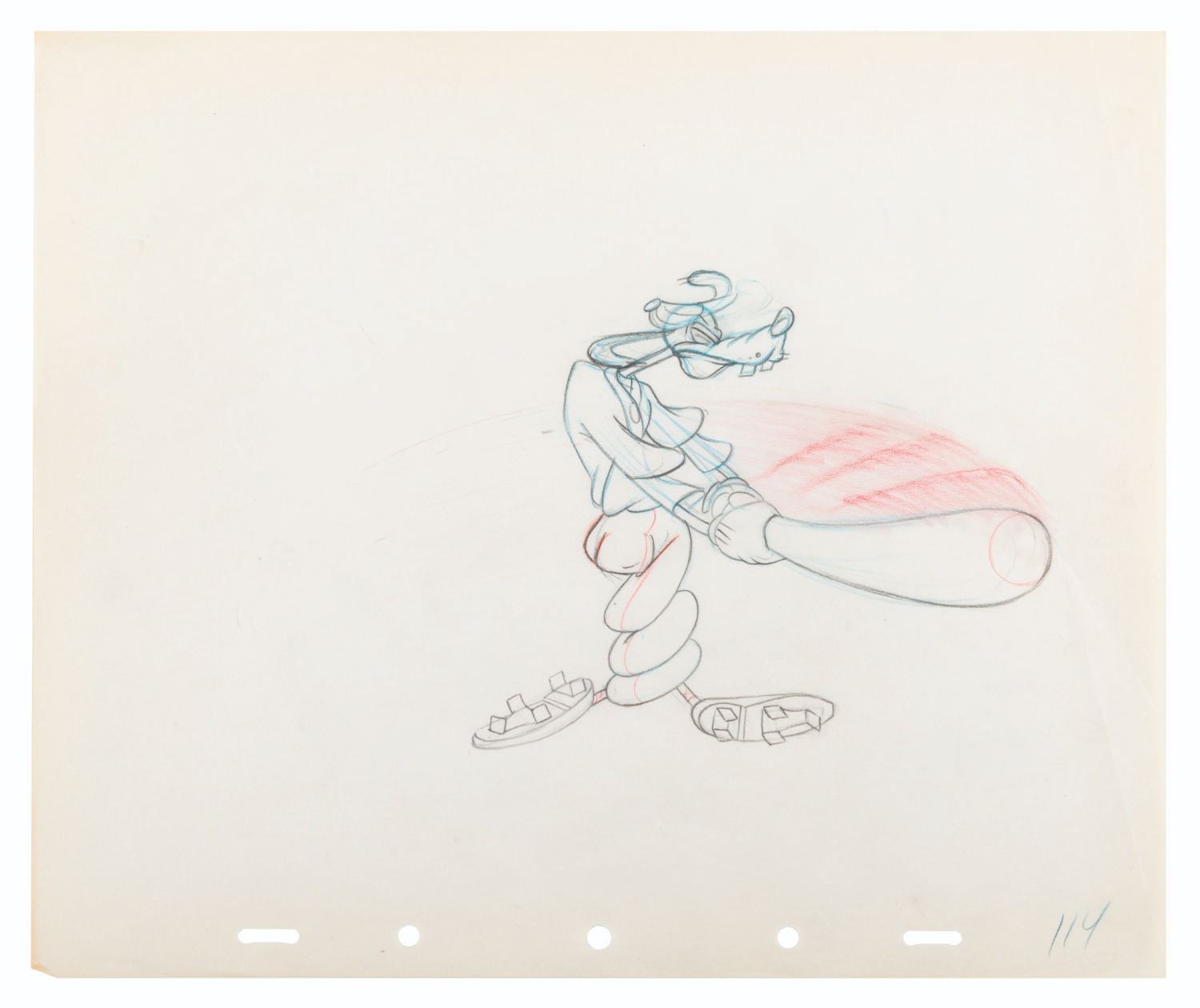 (Disney, 1942) An original production drawing of Goofy swinging a bat from the animated short "How to Play Baseball." Goofy has an image size of 5.25" x 6.25" on 10" x 12" animation paper. The graphite and colored pencil drawing is in very good condition with discoloration from age, light folds at the corners, and creases throughout, particularly on the right side.