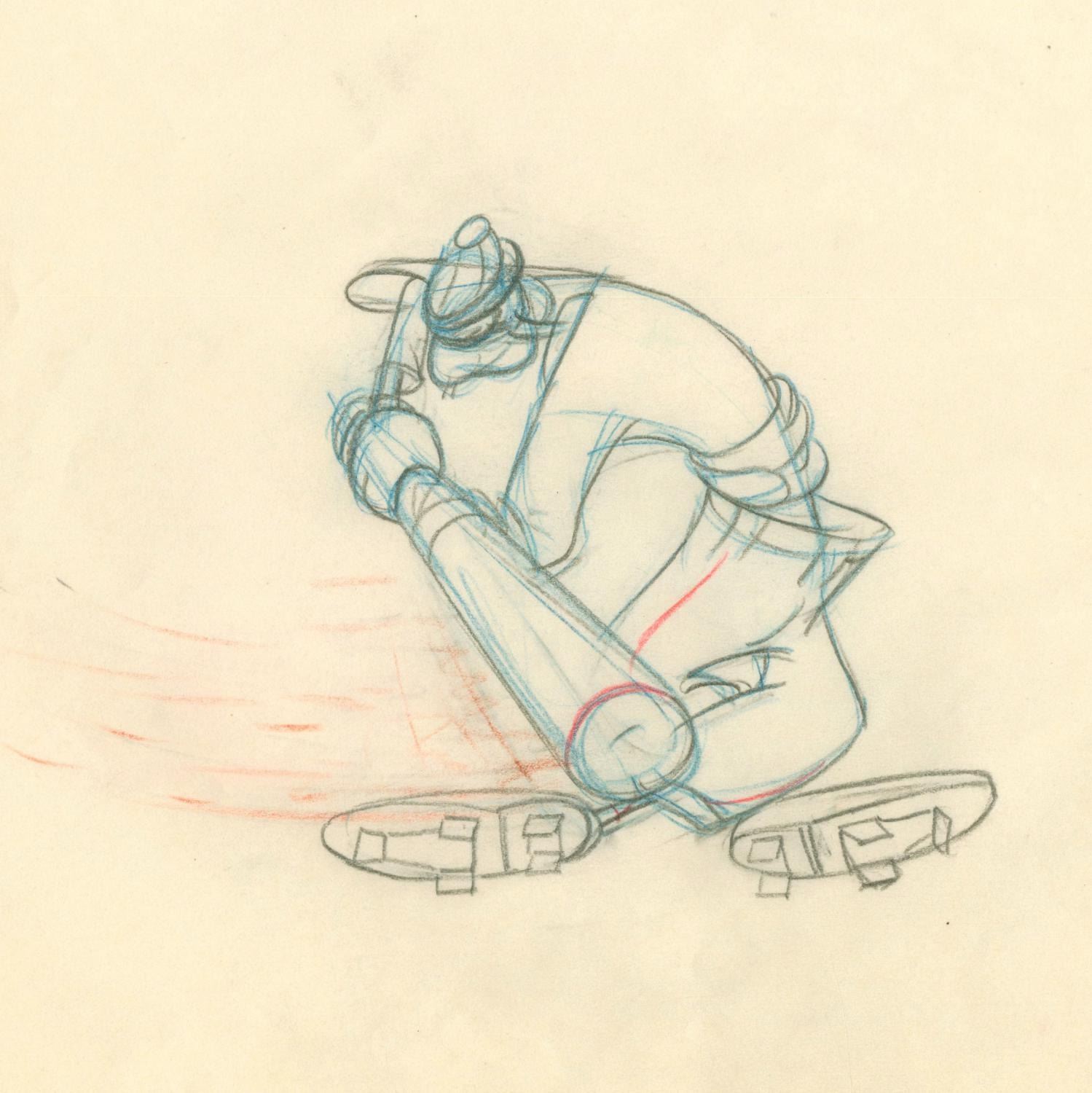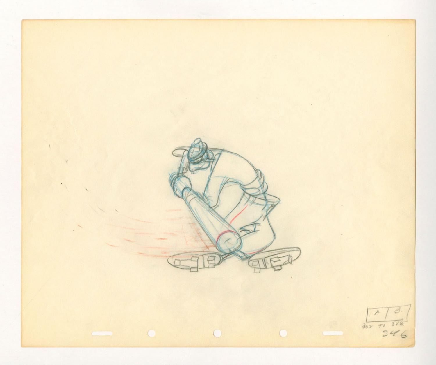 (Disney, 1942) An original production drawing of Goofy from the animated short "How to Play Baseball. " Goofy has an image size of 4 " x 6.75 " on 10 " x 12 " animation paper. The graphite and color pencil drawing is in very good condition with discoloration from age, light creases, and edge wear.