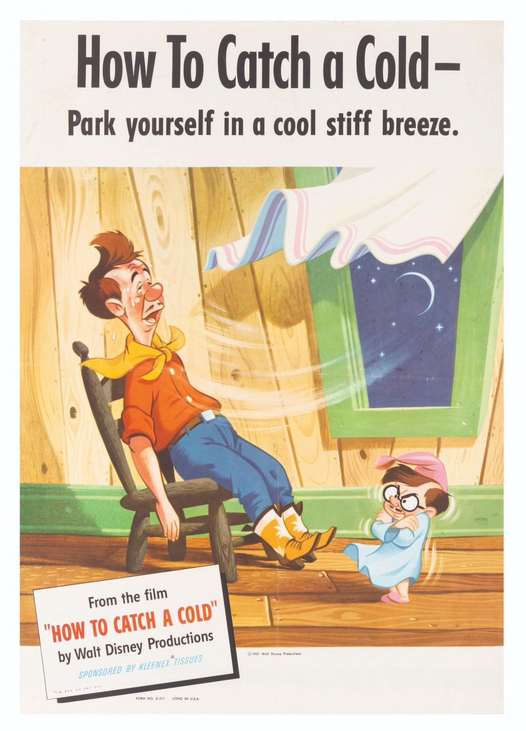 (Disney, 1951) A promotional poster for the Disney animated educational short "How To Catch a Cold." A series of six different posters for the film were produced with information on how to catch, spread, and cure a cold. Measuring 14" x 20", this "Cool Stiff Breeze" poster displays in good condition with edge wear including small tears, creases, spotting, pinholes, and a full horizontal fold at the center.
