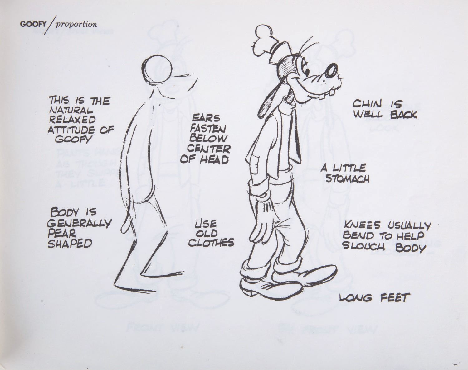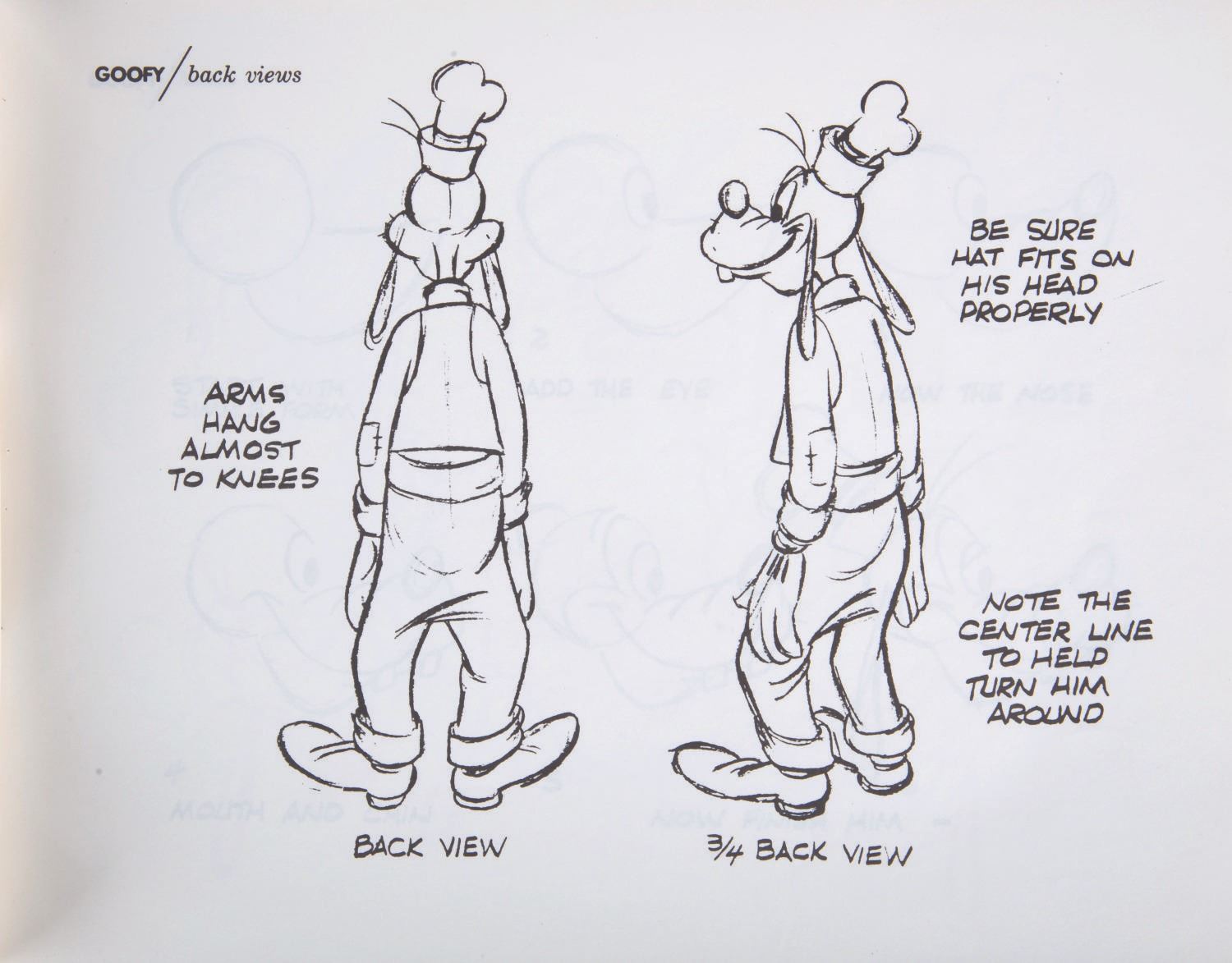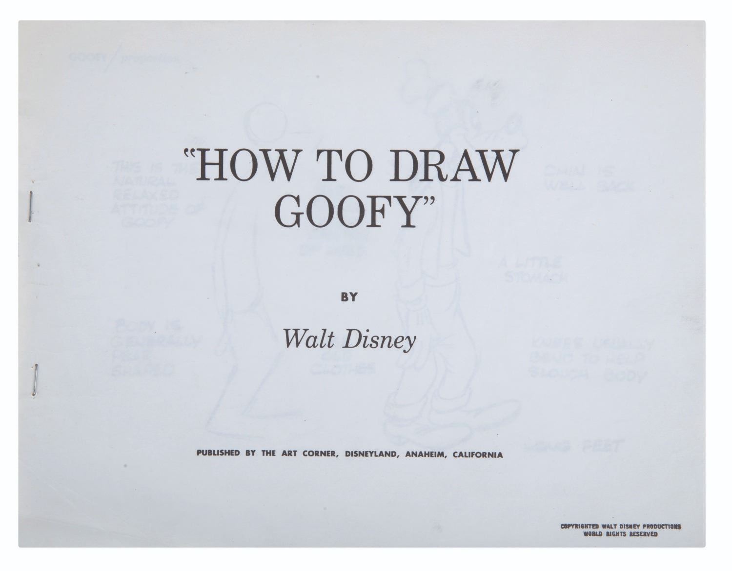 (Disneyland, 1950s-60s) A "How to Draw Goofy" published for sale at the Art Corner shop in Tomorrowland. The 11-page book illustrates how to draw Goofy. Stapled, this was never bound with a cover, and was possibly kept as a file or reference copy at Disneyland or the Studio. Measuring 8.5"x11", the book is in very good condition, with light wear from handling and age.