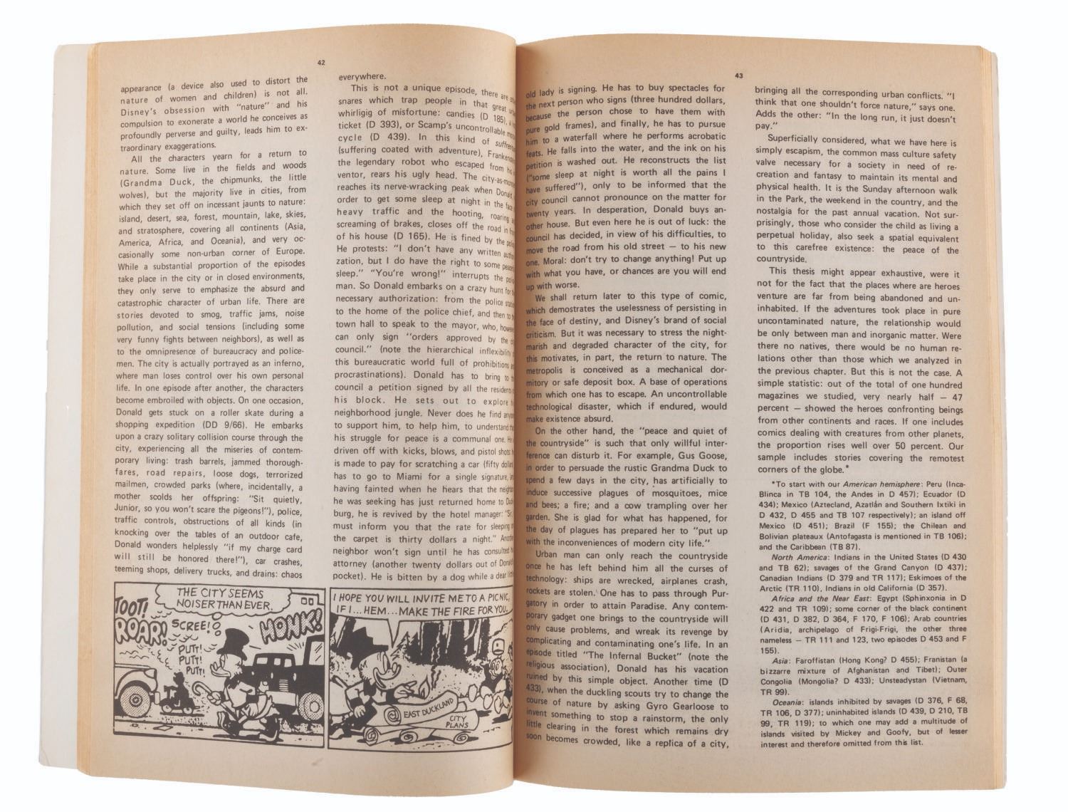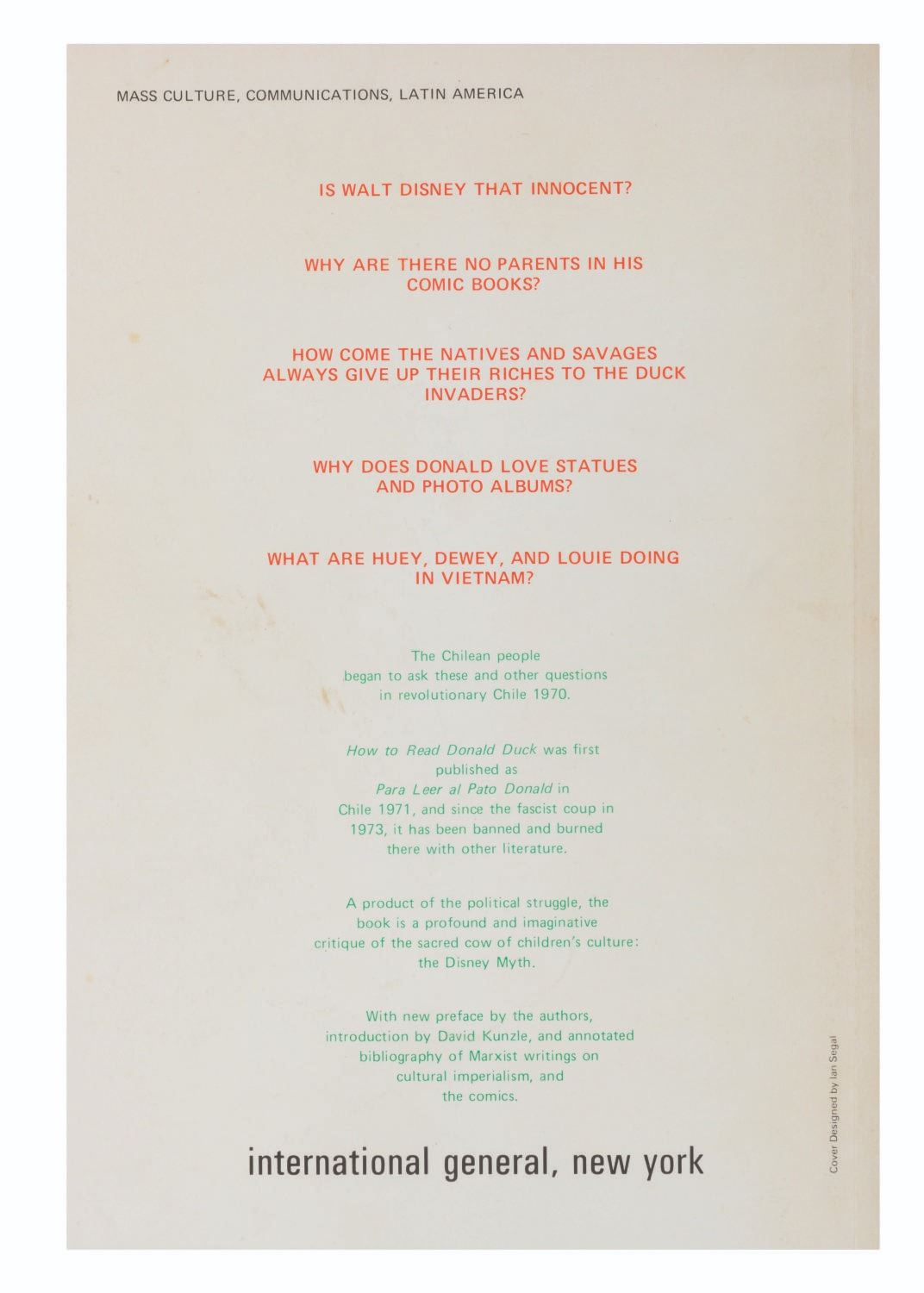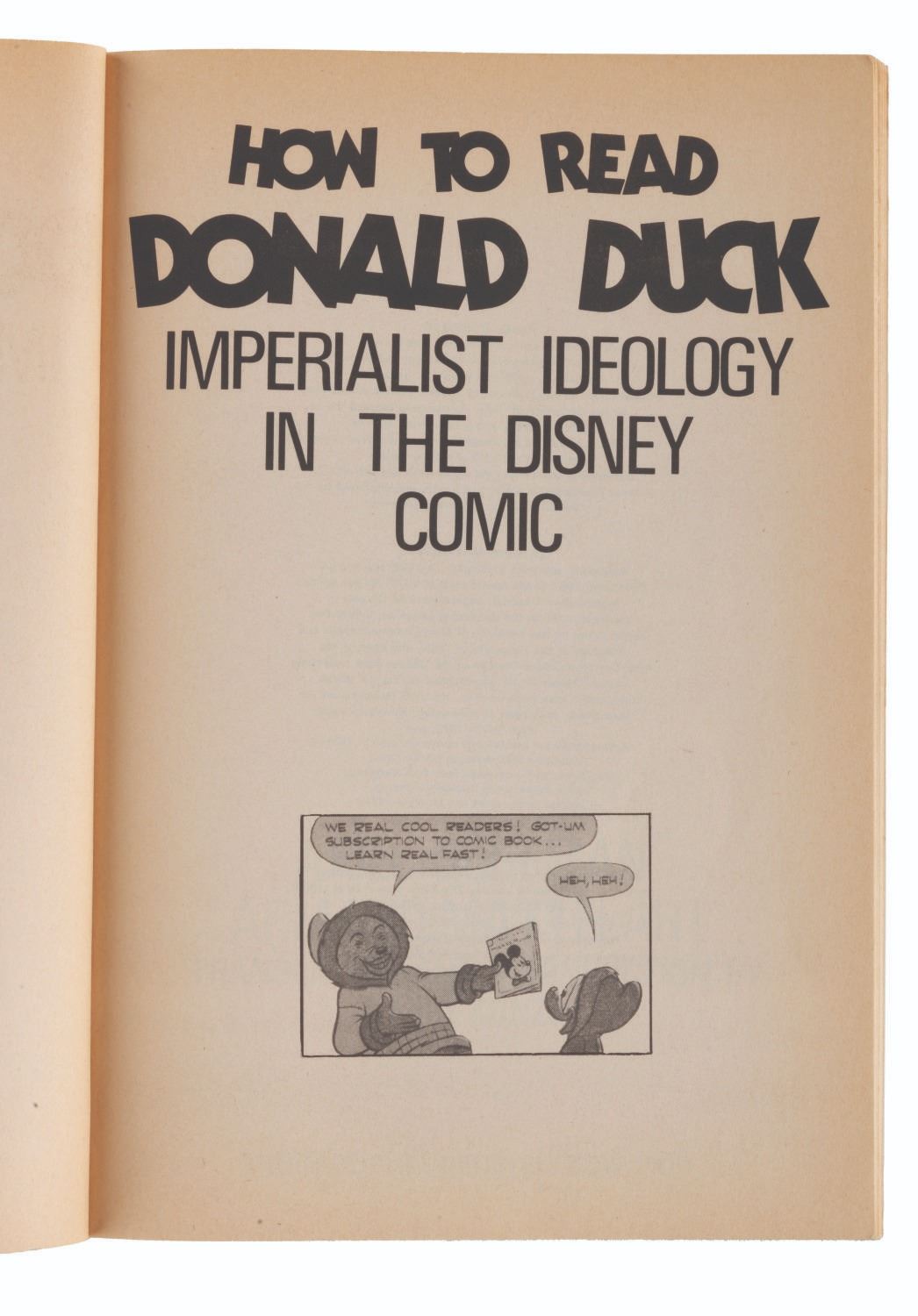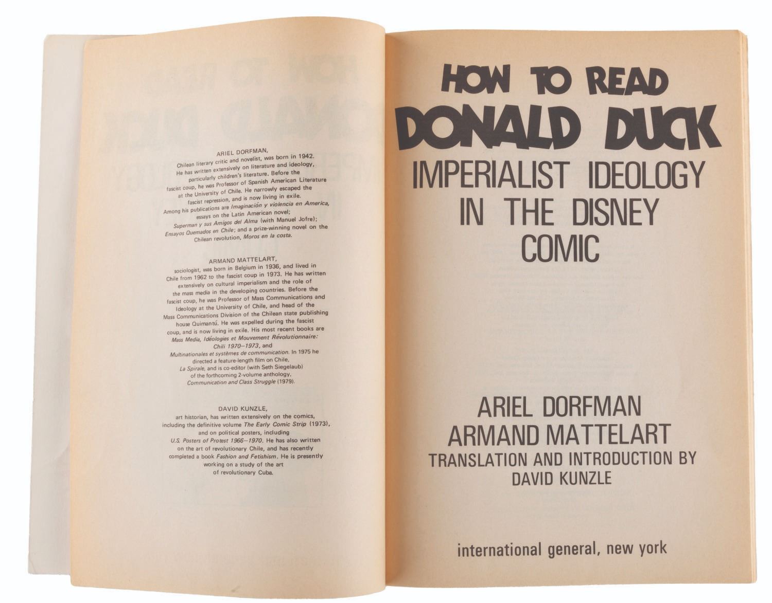 (International General, 1975) A book-length essay titled "How to Read Donald Duck," by Ariel Dorfman and Armand Mattelart, critiquing Donald Duck comics as imperialist propaganda. This book offers a unique point of view regarding Disney's success and Latin American politics of the 1970s. The 112-page essay measures 10.25" x 7" and is in good to very good condition, with some edge wear to the corners, and surface wear to the cover, including spots of bending and peeling from age and use.