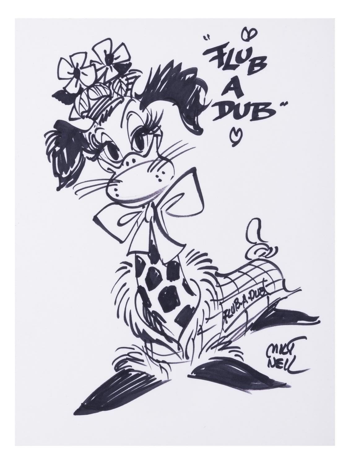 (Neil, 1980s-90s) A drawing of the hybrid animal Flub-a-Dub from "Howdy Doody" by animator Milt Neil, signed and illustrated in black marker. Neil is known for his work on the beloved puppet show designing puppets and adapting it into a comic strip. With an image size of 7.5” x 10.5” on 9” x 12” paper, the drawing is in fine condition.