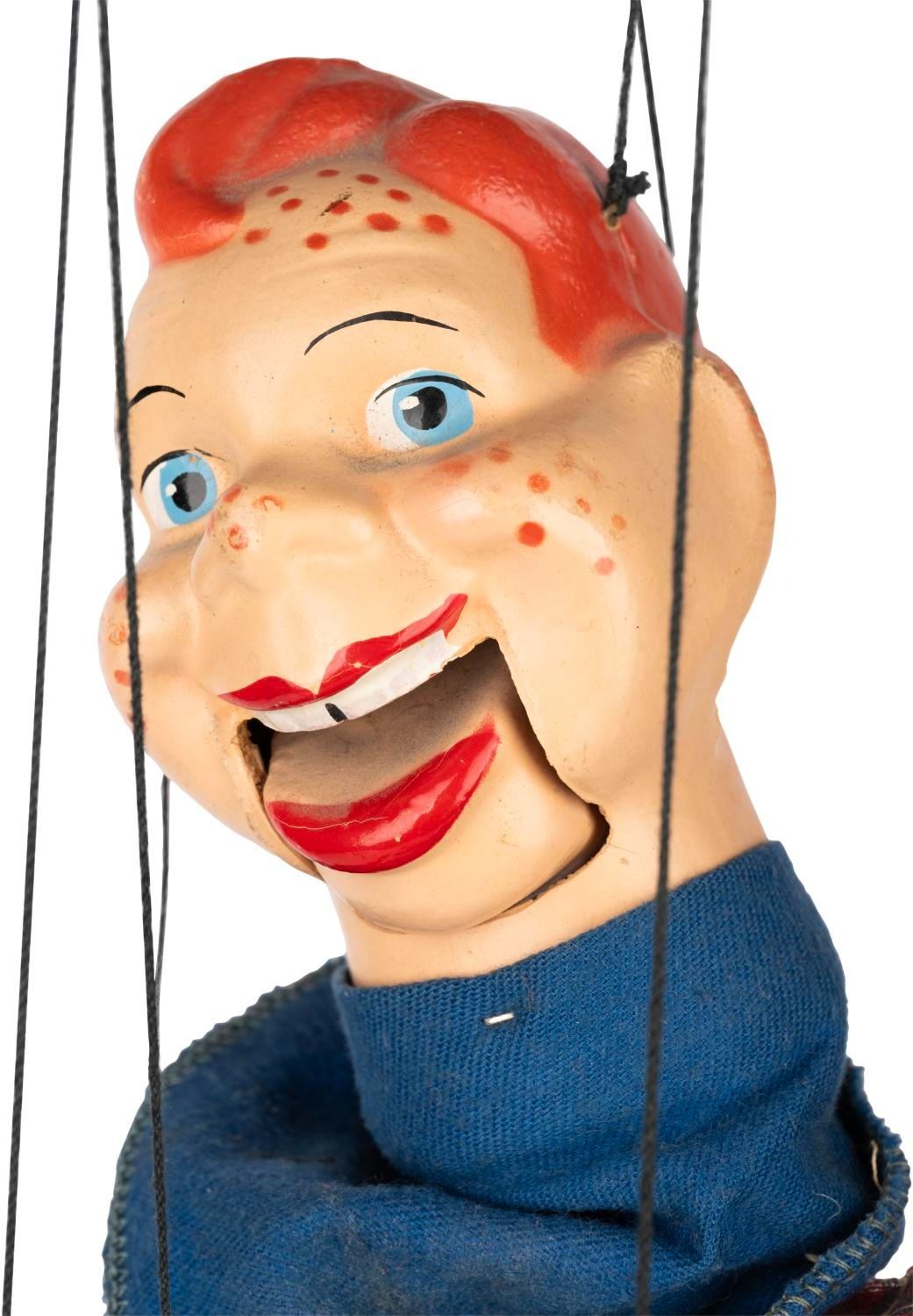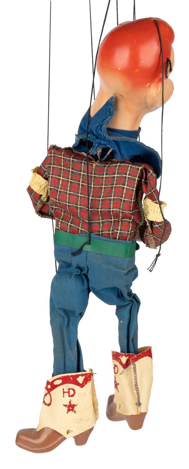 (Peter Puppet Playthings, 1950s) A Howdy Doody marionette with controller. Measuring 15” tall (not including strings), the marionette is in good condition, with a broken string to the mouth, and wear mainly to the clothes and boots from play.