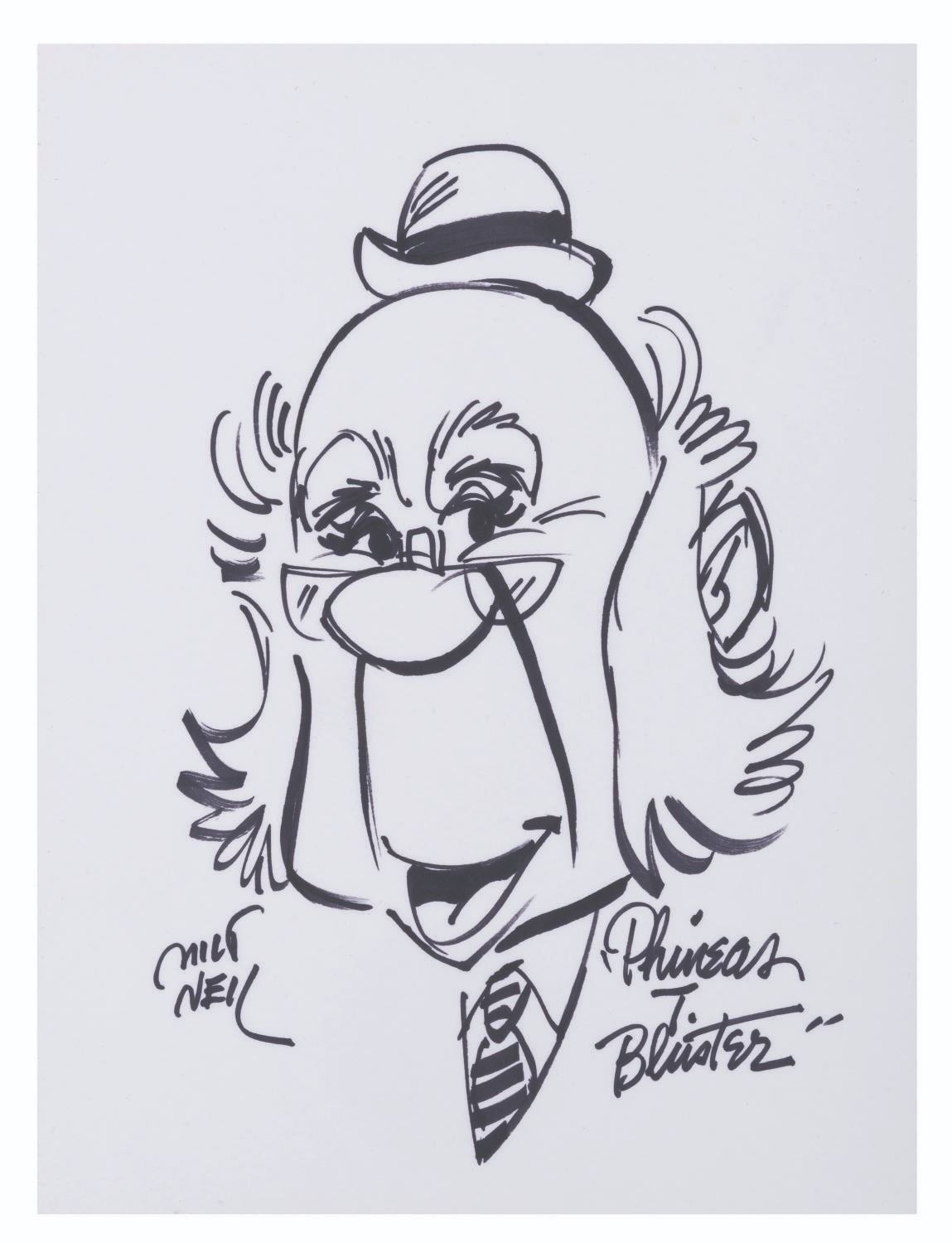 (Neil, 1970s-90s) A drawing of Phineas T. Bluster by animator Milt Neil who designed puppets and merchandise for The Howdy Doody Show. Accomplished in marker and signed in the lower left, the drawing with an image size of 10.5" x 7.25" on 12" x 9" paper is in fine condition.