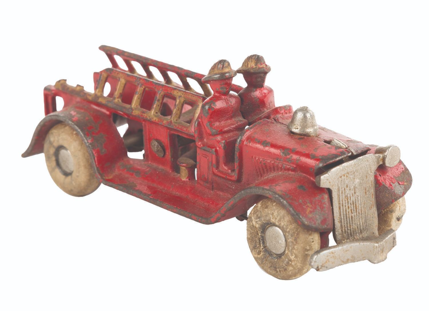 (Hubley, 1930s) A cast-iron fire truck toy manufactured by Hubley. Measuring 5" x 2" x 2" tall, the toy displays in fair condition with heavy paint loss, oxidation, half of its grill missing, part of one ladder missing, and cracks in the tires.