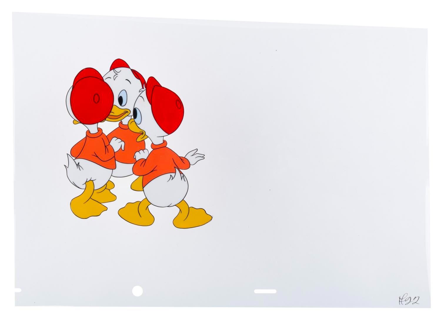 (Disney, 1958) An original production cel of Huey, Dewey, and Louie from the Disneyland television series episode “Donald’s Weekend.” With a character image size of 4.75” x 4” on a trimmed 8” x 11.5” cel, the piece is in very good condition with light paper residue to the reverse from the previous mounting.