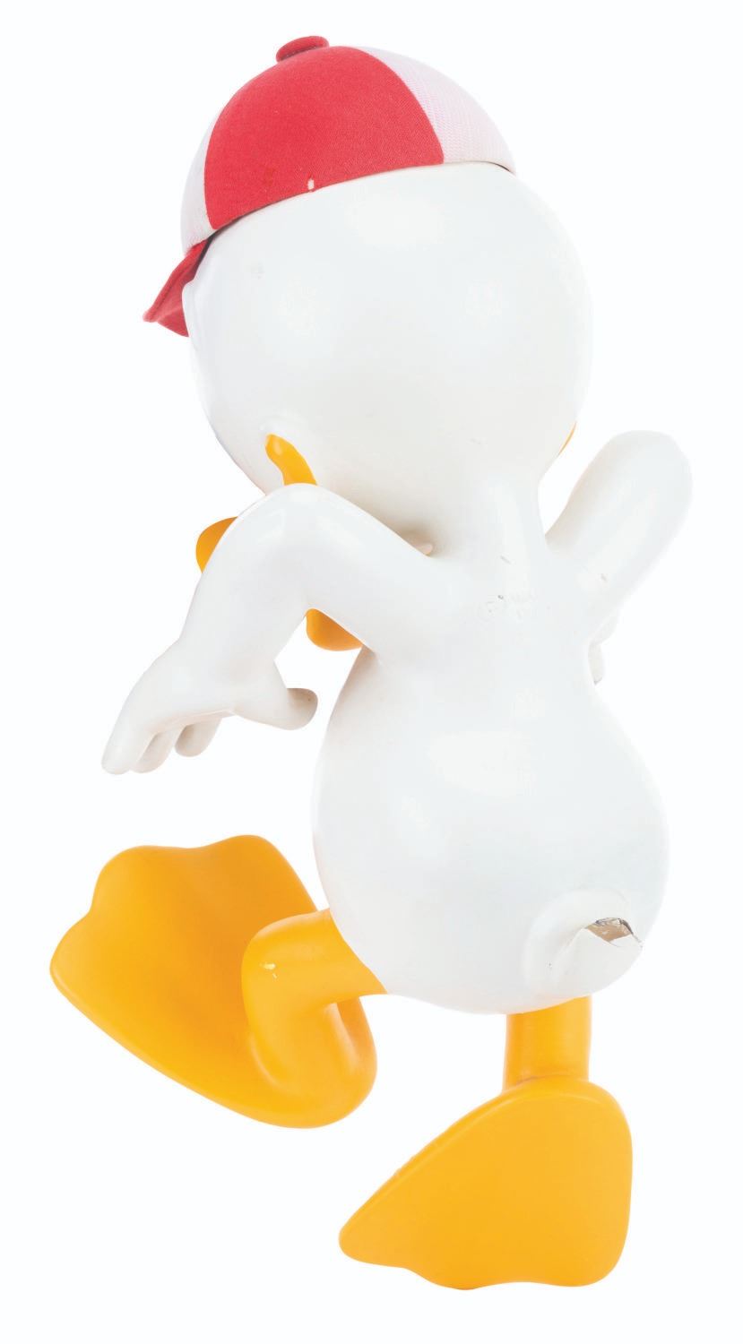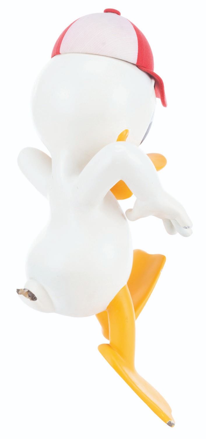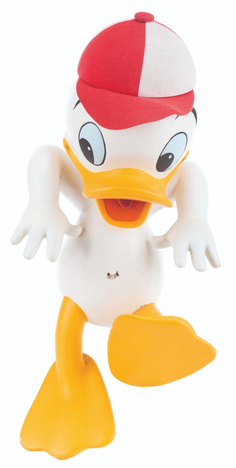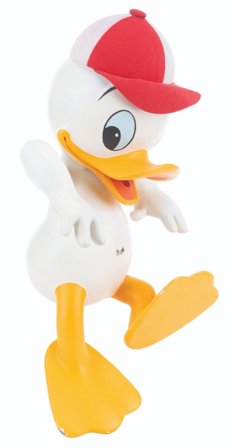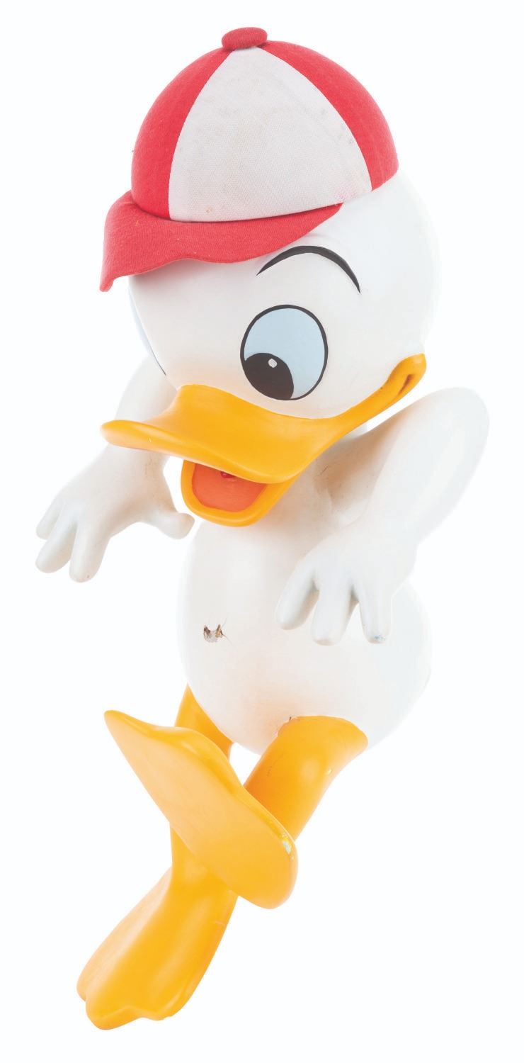 (Disney, 1988) An original Disney Store display figure of Donald’s nephew, Huey. This figure was part of a display titled "Earthquack,” where Donald’s nephews rode in a mine cart, with Huey hanging off the edge from the handbrake. Measuring 16.5” x 8” x 8”, the figure is in fair condition missing the clothing, cracks ranging from 0.25 to 3.5” throughout, two holes in the center chest from mounting screws, a screw in the head, a 3.5” strip of adhesive residue along the forehead from the detached but included hat, stains and a hole in the hat, and the tail broken off. Due to size and weight, special shipping arrangements are required. Please inquire before bidding.