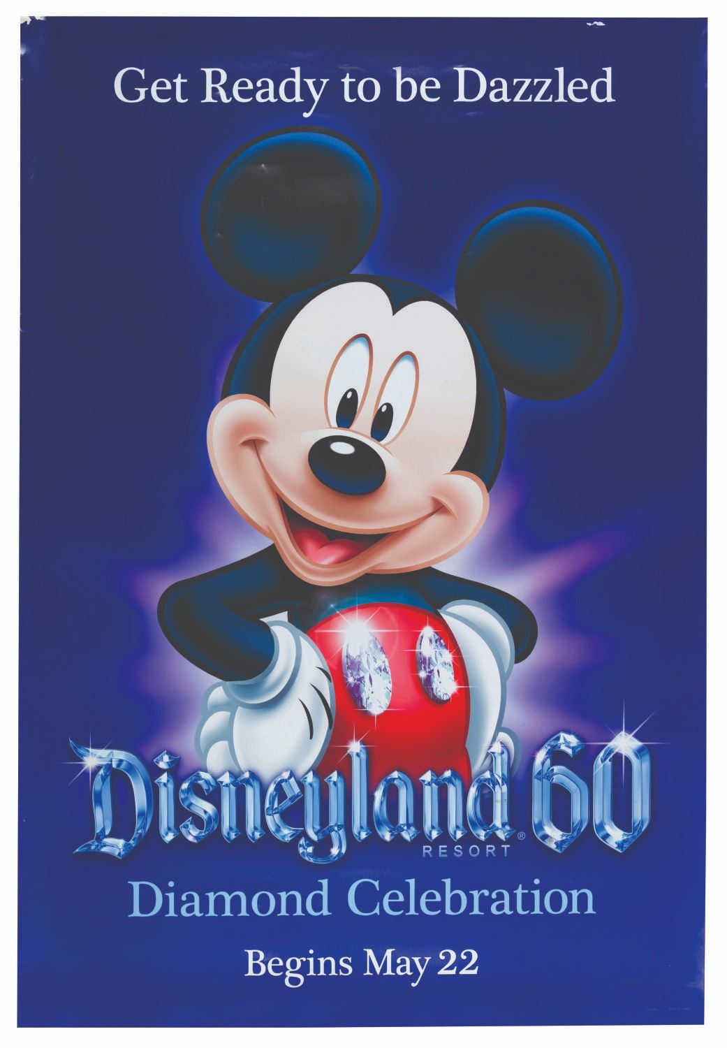 (Disneyland, 2015) a very large vinyl poster of Mickey Mouse from Disneyland's Diamond 60th Anniversary. Measuring 48” x 69”, the poster is in very good condition with expected wear from Park display, including several small creases throughout, and edge wear including a small tear to one corner, very small chipping, small tears, and spots of color loss.