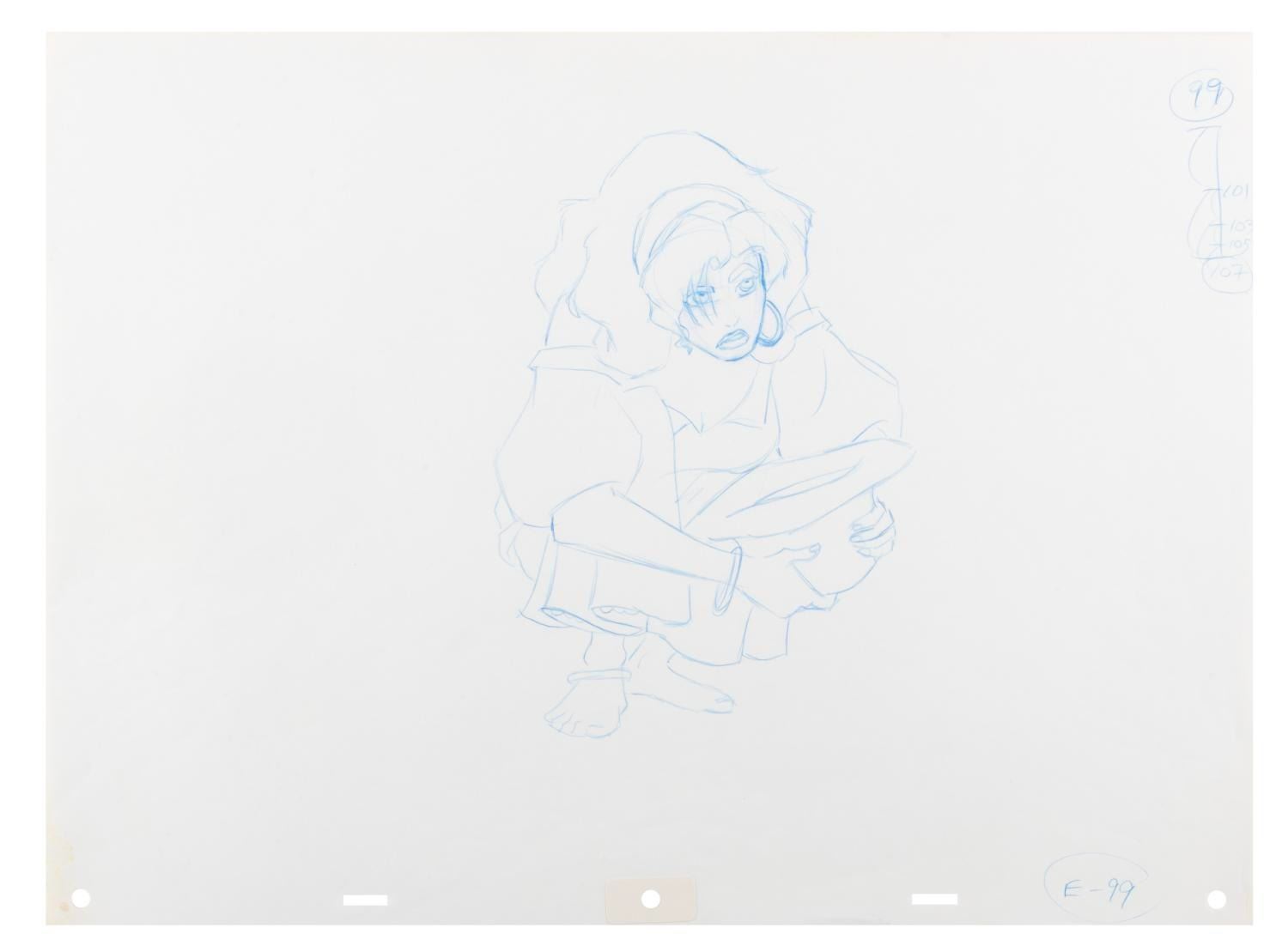 (Disney, 1996) An original production drawing of Esmeralda from Disney’s “The Hunchback of Notre Dame.” Esmeralda has an image size of 6” x 8.5” on 12.5” x 17” animation paper. The red pencil drawing is in very good condition with very light edge wear from production use and a light stain at the lower left corner.