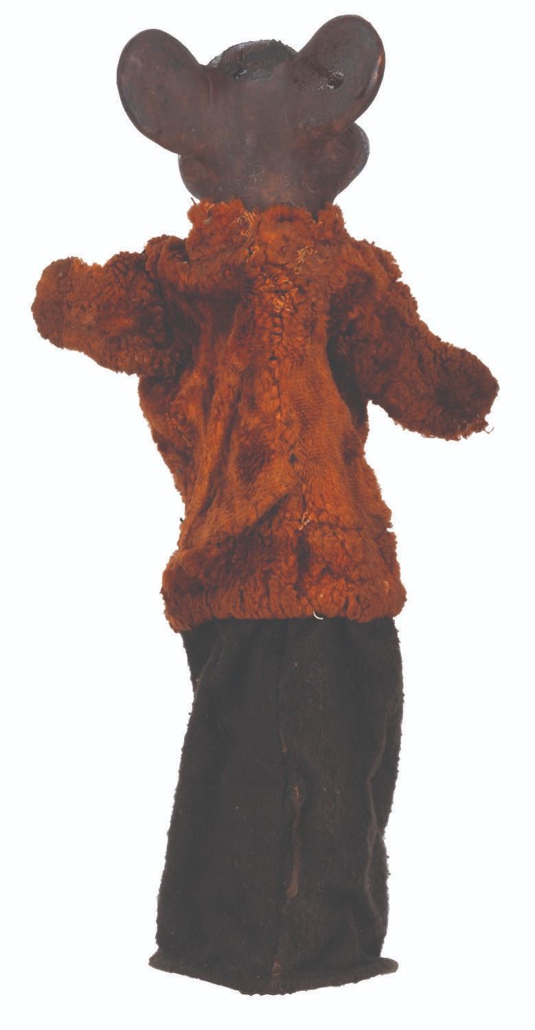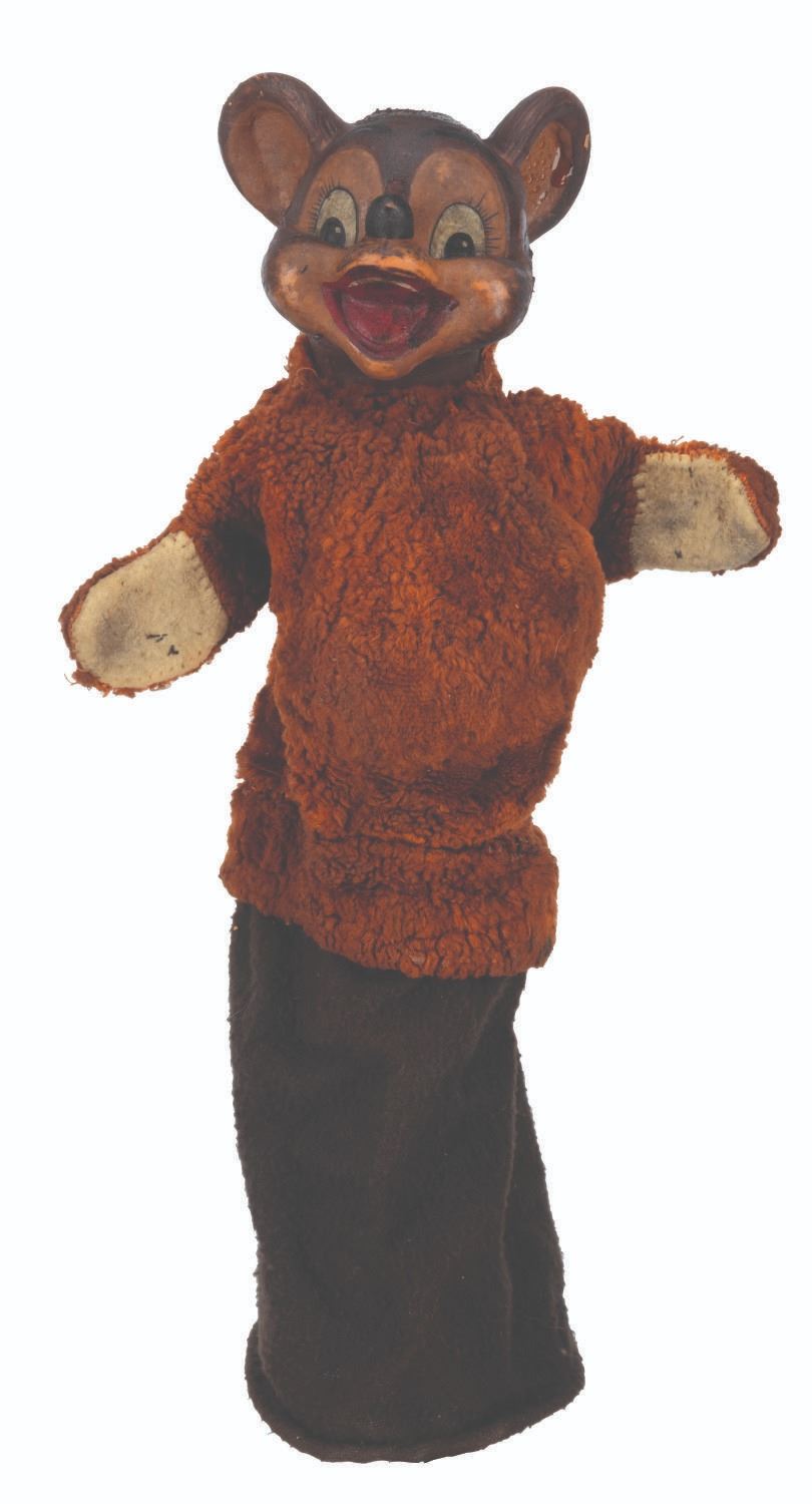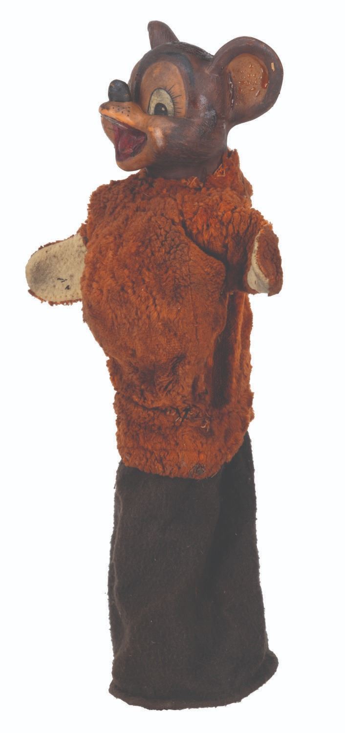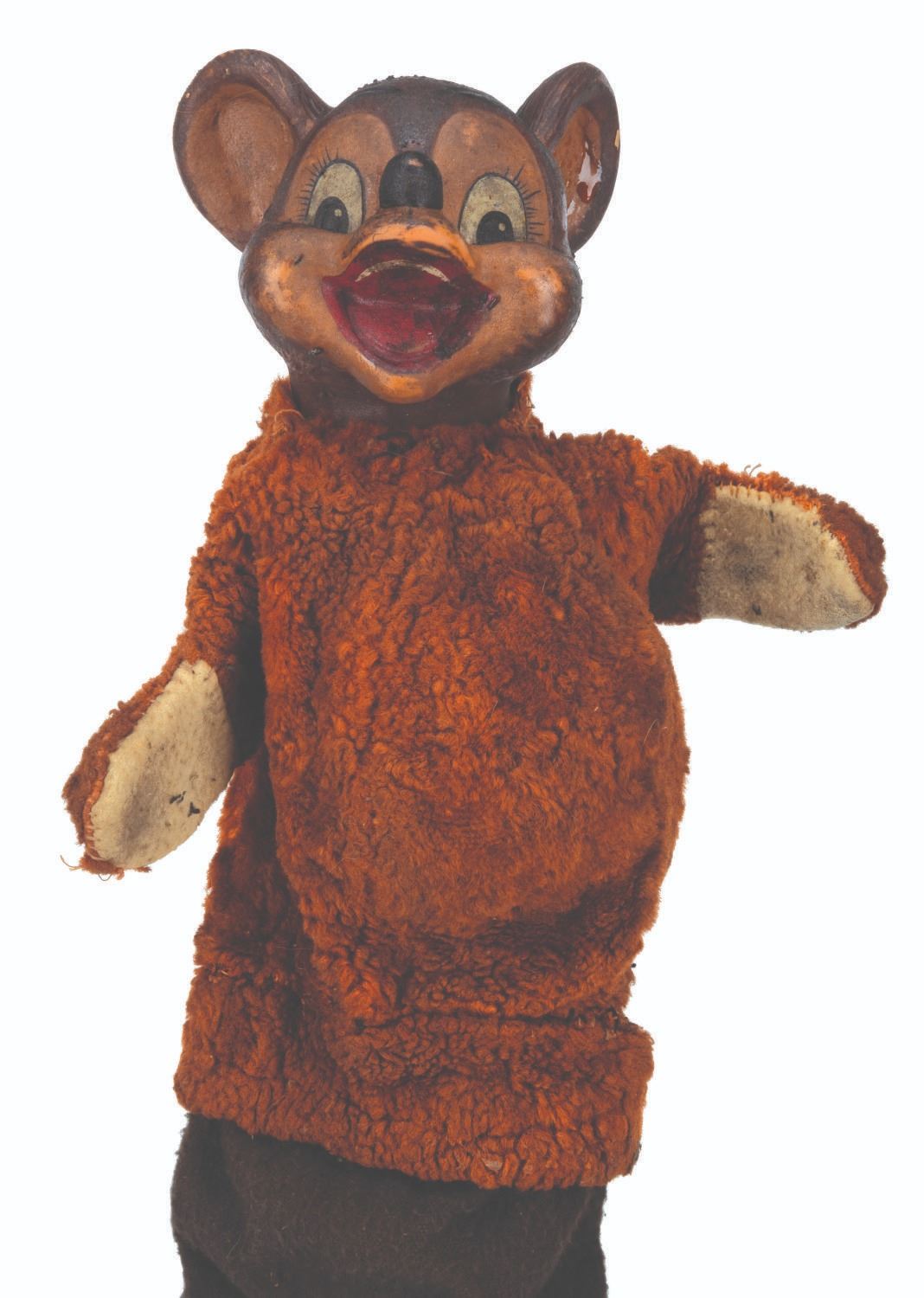 (Clampett, 1949-55) A screen-used puppet of Hunny Bear from “Time for Beany.” Many secondary character puppets for the series were made by Maurice Siederman, who included his company’s signature “Lastic Plastics,” sculpted into their necks. Constructed of rubber, terrycloth, cotton, and wire and measuring 8" x 3.5" and 15" tall, the puppet displays in fair condition with heavy plasticization stickiness to the head from age and soiling throughout.