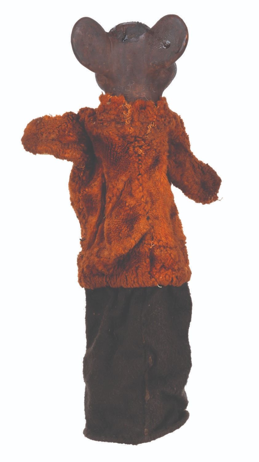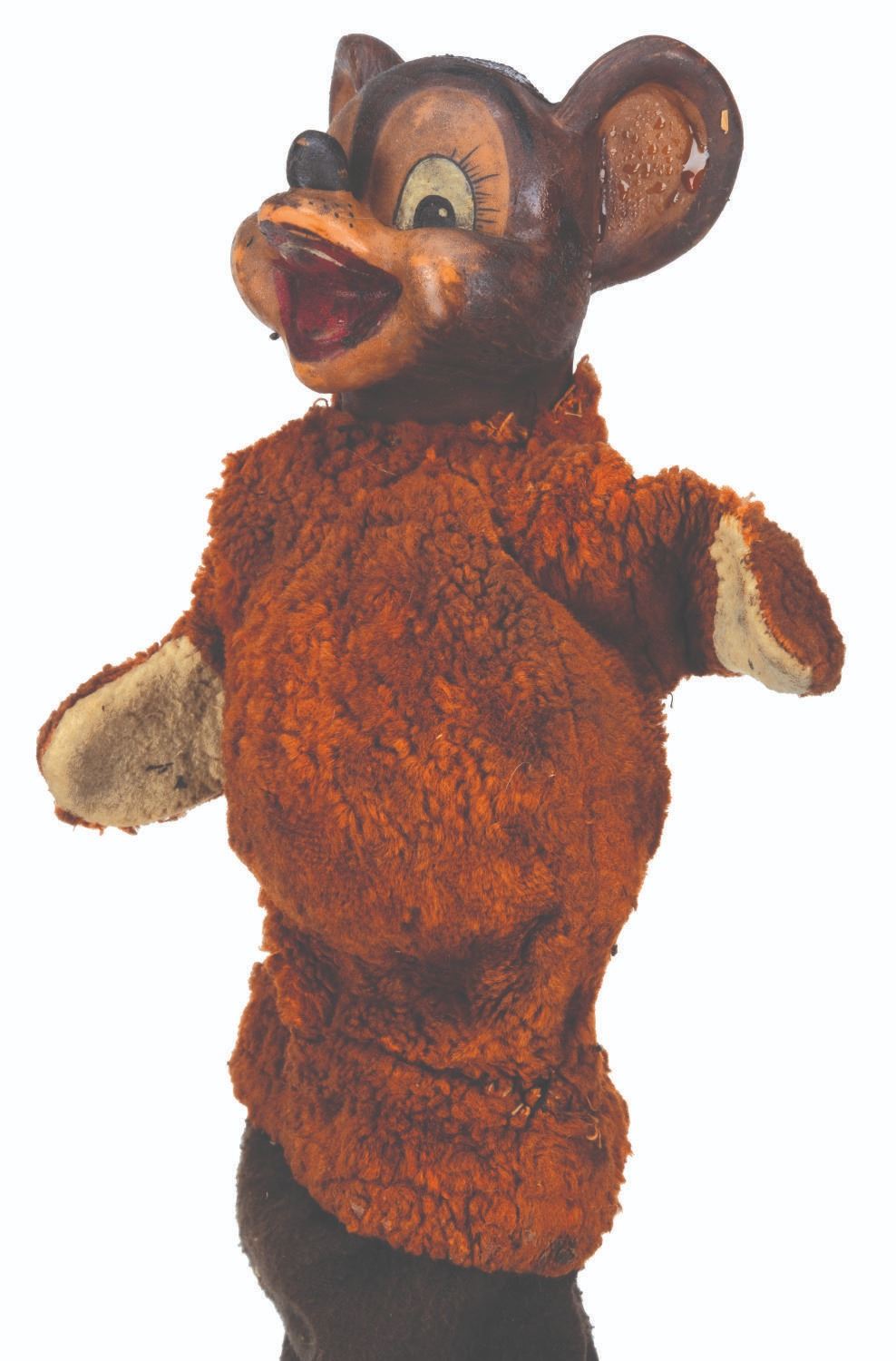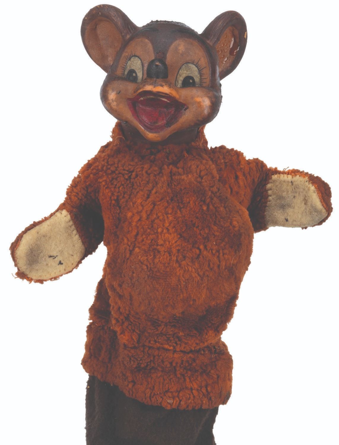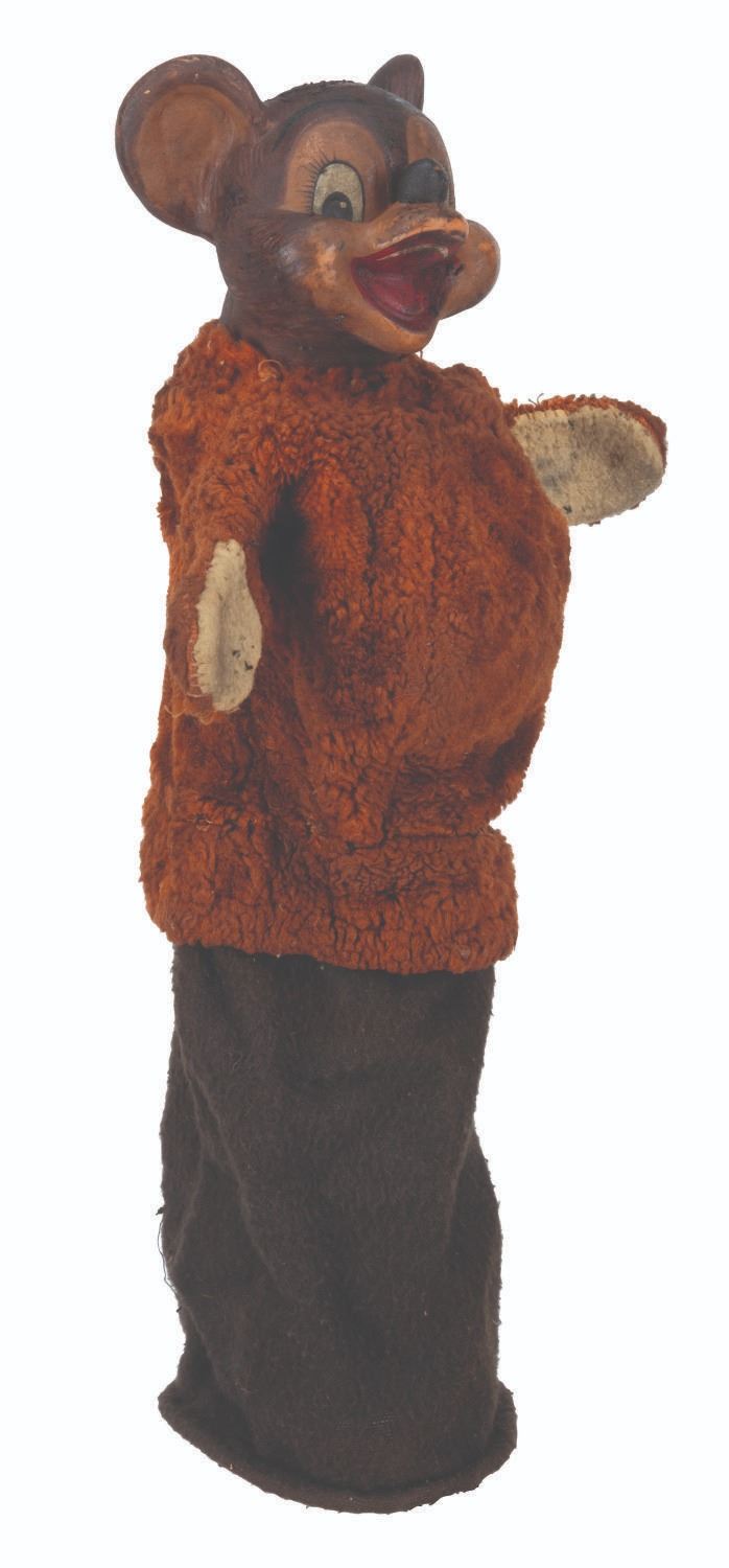 (Clampett, 1949-55) A screen-used puppet of Hunny Bear from “Time for Beany.” Many secondary character puppets for the series were made by Maurice Siederman, who included his company’s signature “Lastic Plastics,” sculpted into their necks. Constructed of rubber, terrycloth, cotton, and wire and measuring 8" x 3.5" and 15" tall, the puppet displays in fair condition with heavy plasticization stickiness to the head from age and soiling throughout.