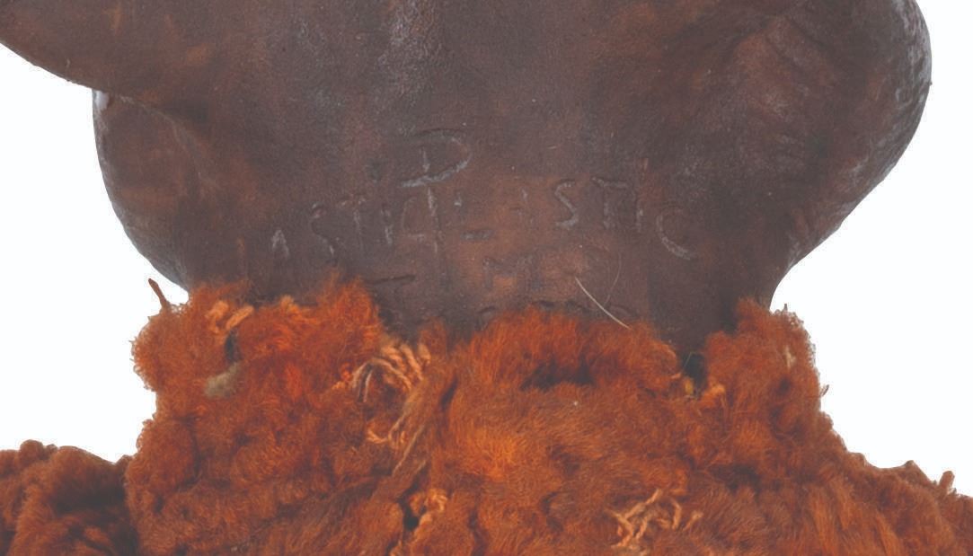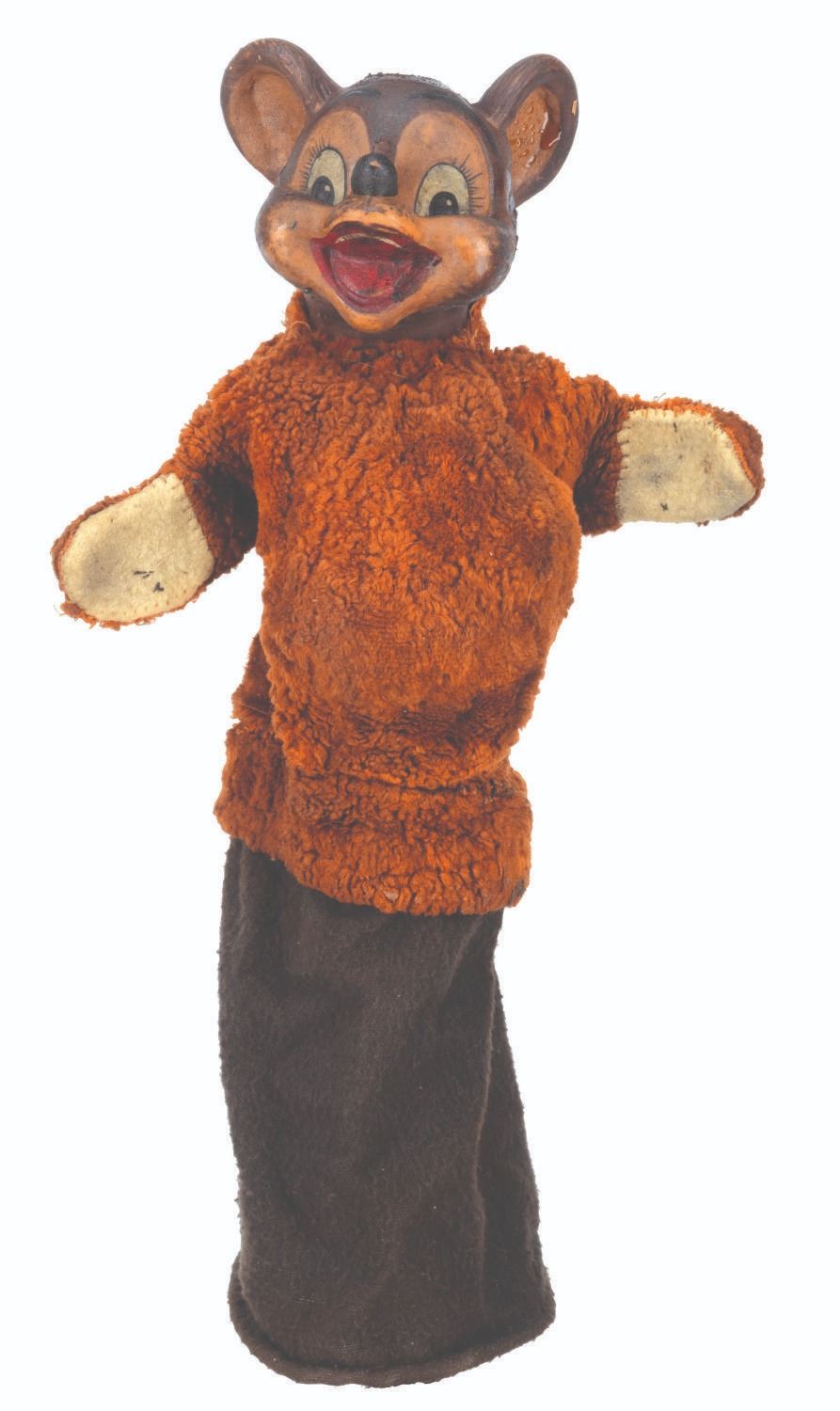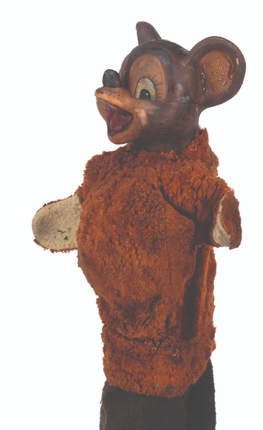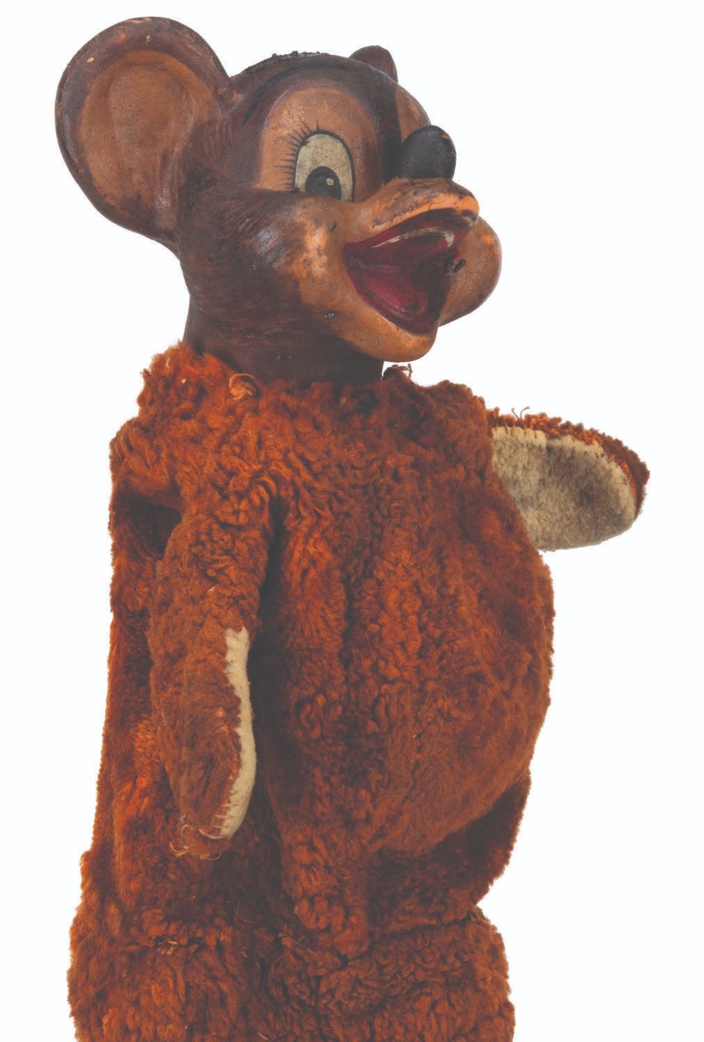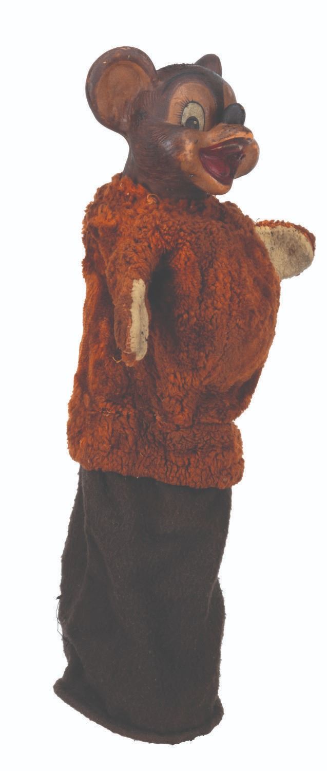 (Clampett, 1949-55) A screen-used puppet of Hunny Bear from “Time for Beany.” Many secondary character puppets for the series were made by Maurice Siederman, who included his company’s signature “Lastic Plastics,” sculpted into their necks. Constructed of rubber, terrycloth, cotton, and wire and measuring 8" x 3.5" and 15" tall, the puppet displays in fair condition with heavy plasticization stickiness to the head from age and soiling throughout.