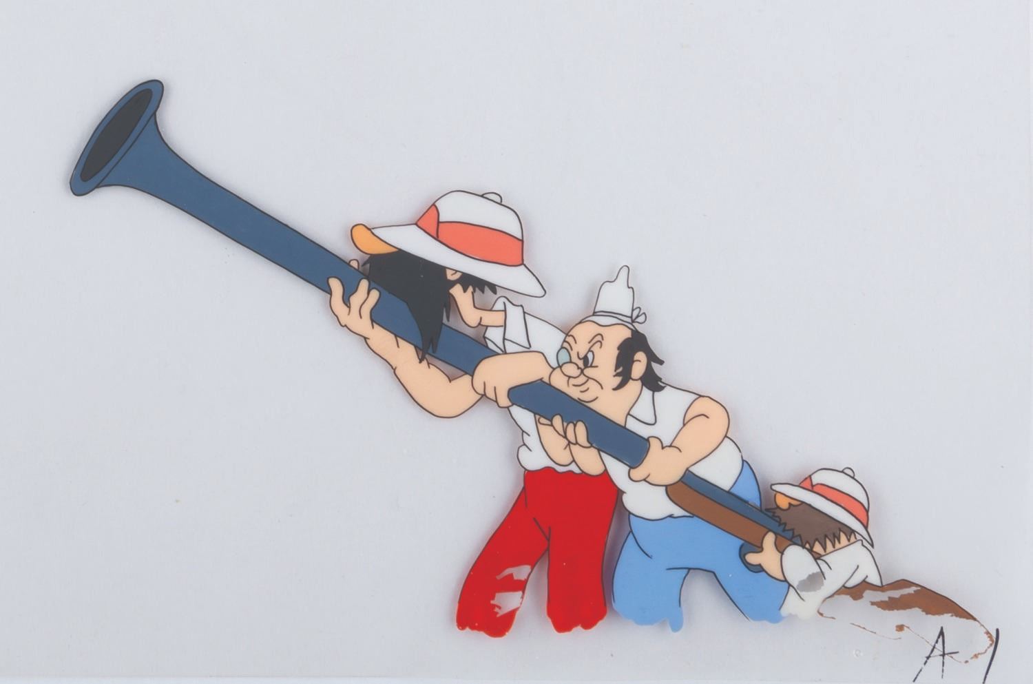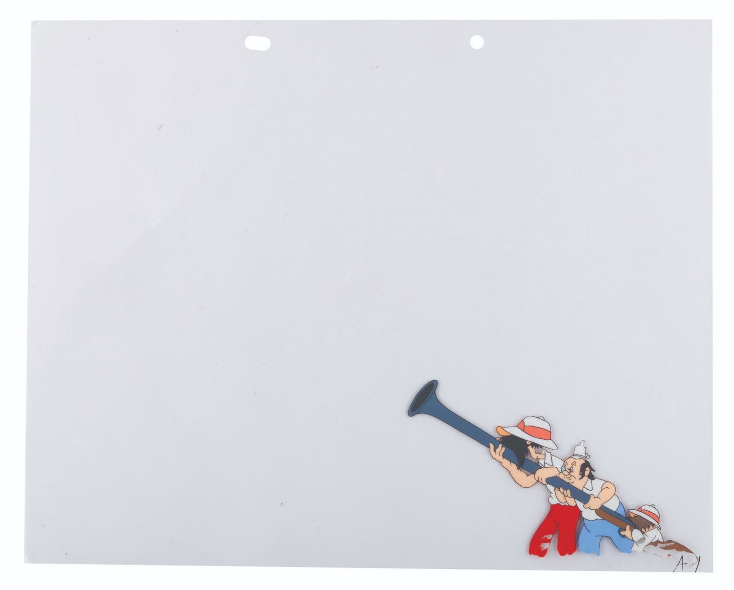 (Schlesinger, 1942) An original hand-painted production cel of a trio of hunters from the Merrie Melodies short “Horton Hatches the Egg.” With an image size of 3.5” x 5.5” on a 10” x 12.5” cel, the piece displays in good condition with paint loss, scratches, wear, and pinholes from production use.