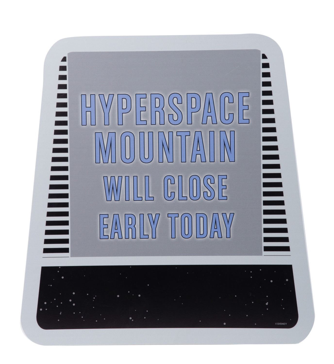(Disneyland resort, 2010s) A "Hyperspace Mountain Will Close Early Today" sign created for the seasonal "May the 4th" Star Wars overlay of Space Mountain. Measuring 22.25"x21", the acrylic sign is in fine condition with minor signs of wear.